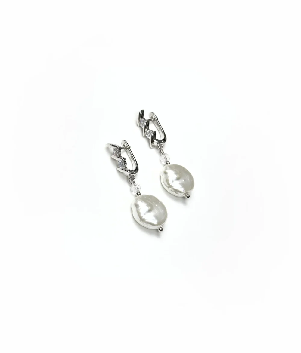 Серьги выполнены из жемчуга майорка и натурального горного хрусталя в ювелирной огранке.