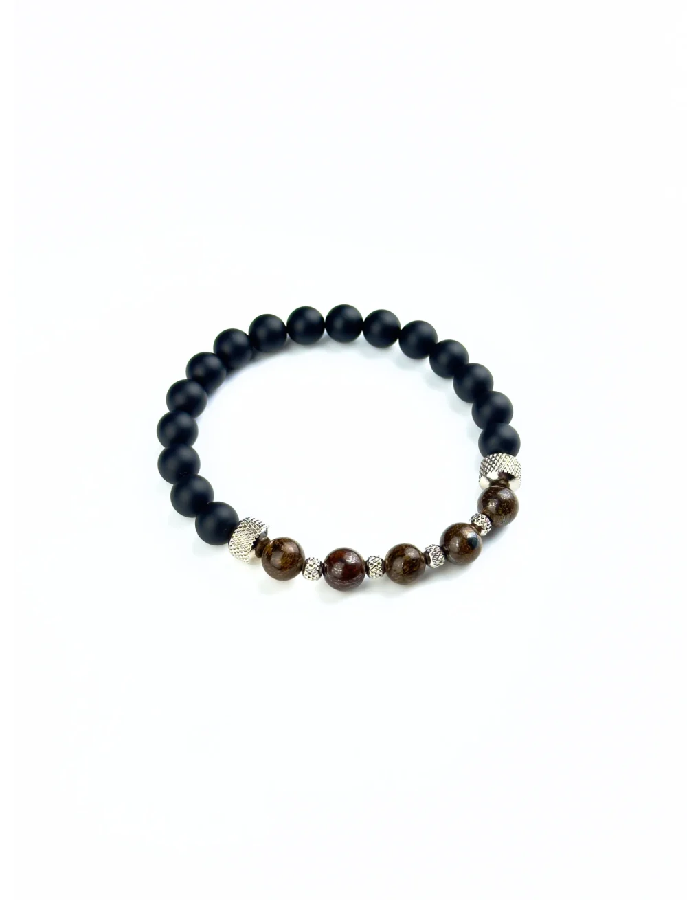 Браслет выполнен из натуральных камней – бронзита и черного матового агата и украшен харизматичными вставками из нержавеющей стали. Этот аксессуар станет настоящим акцентом вашего образа, подчеркивая индивидуальность и характер своего владельца.