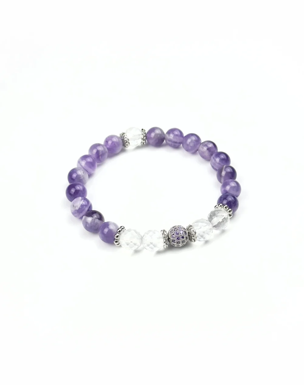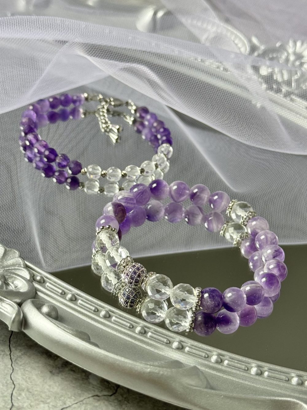 Браслет АРОМАТ ЛАВАНДЫ — воплощение утонченности и красоты. Выполненный из натуральных камней – аметиста и горного хрусталя, он дарит вам ощущение легкости и грации.