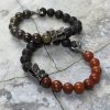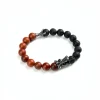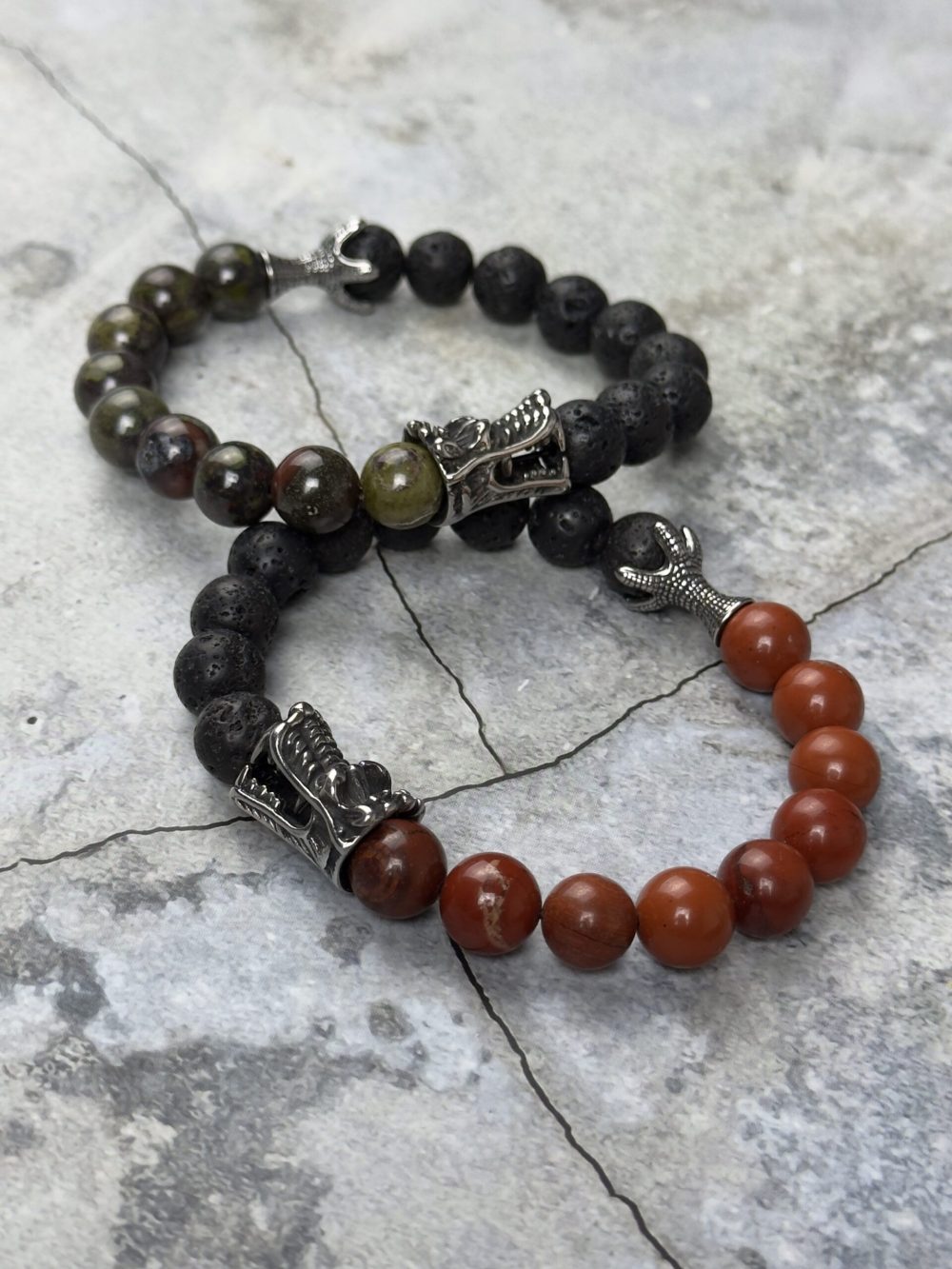 Браслет выполнен из натуральных камней – красной яшмы и вулканической лавы – и дополнен харизматичными вставками из нержавеющей стали в виде головы и когтя дракона.