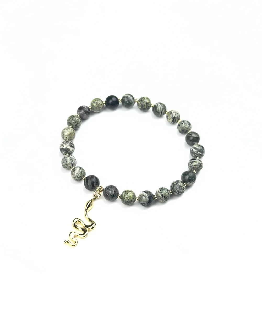 Браслет выполнен из натурального камня змеевика, известного своими целебными и защитными свойствами.