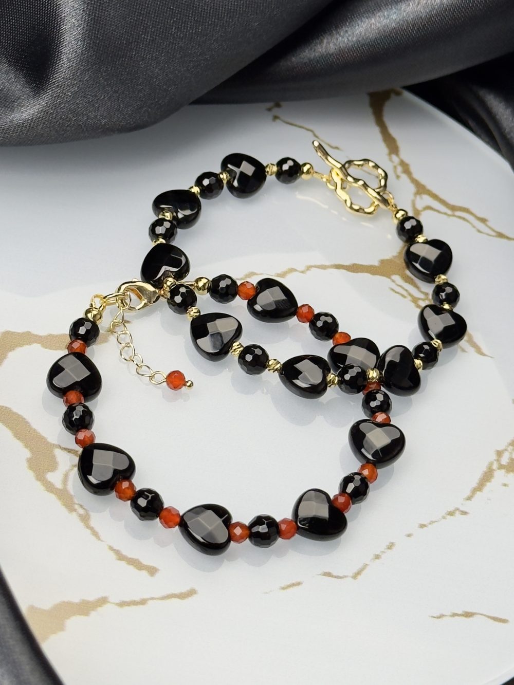 Черный агат в изящной огранке в форме сердец — это диалог между геометрией и эмоцией. Его темная глубина поглощает свет, чтобы вернуть его сдержанным бархатным сиянием, а четкие контуры подчеркивают совершенство линий.