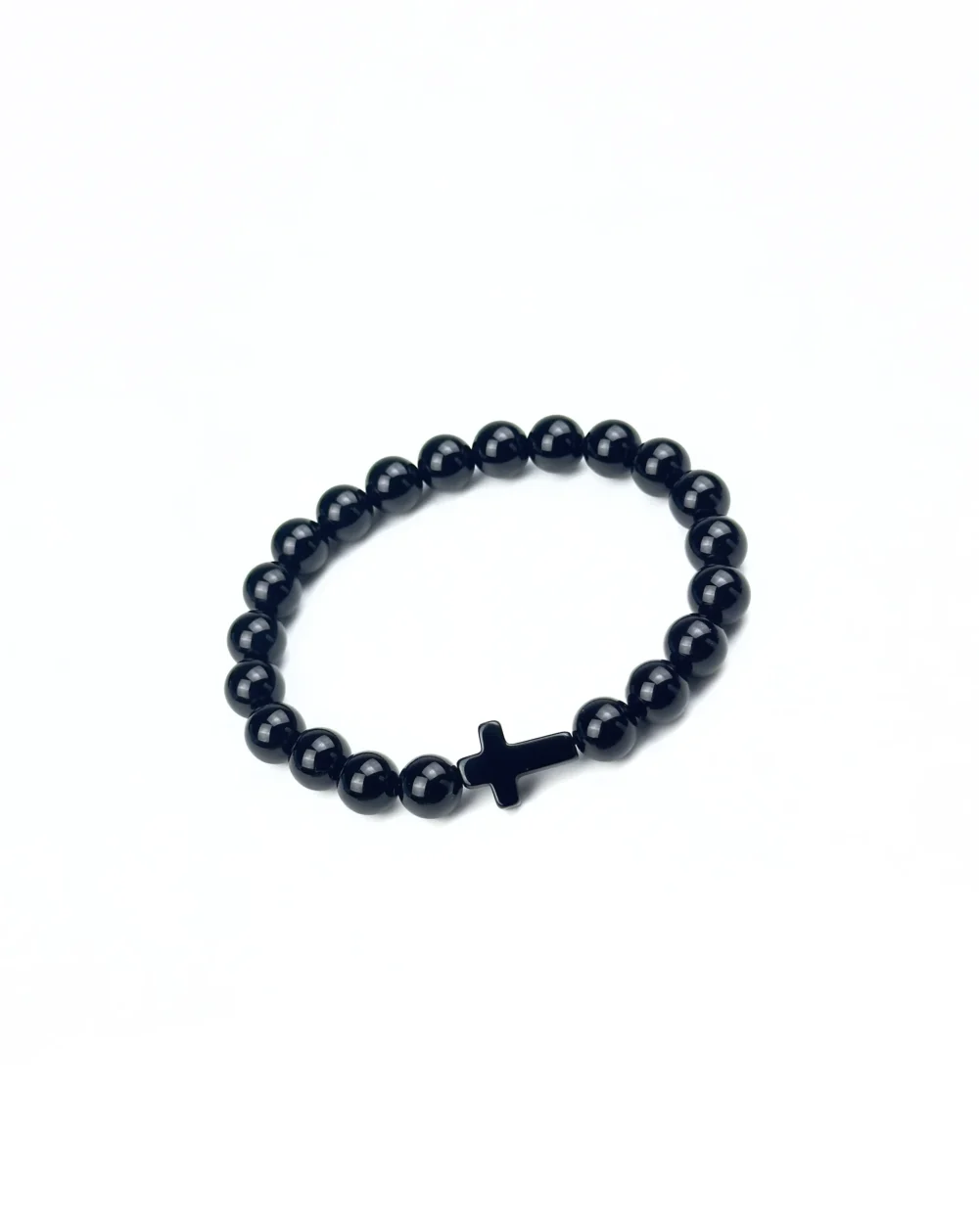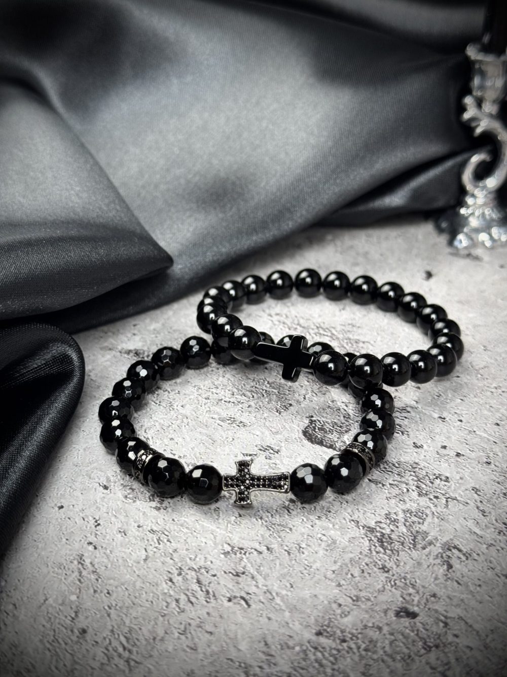 Браслет украшен вставкой в виде креста, также выполненной из натурального черного агата. Символ креста олицетворяет надежду, веру и защиту, что делает этот аксессуар не только стильным, но и глубоким по своему смыслу. Монохромная палитра чёрного агата придает браслету утонченный вид, который легко сочетать с любым нарядом — от повседневного до вечернего.