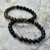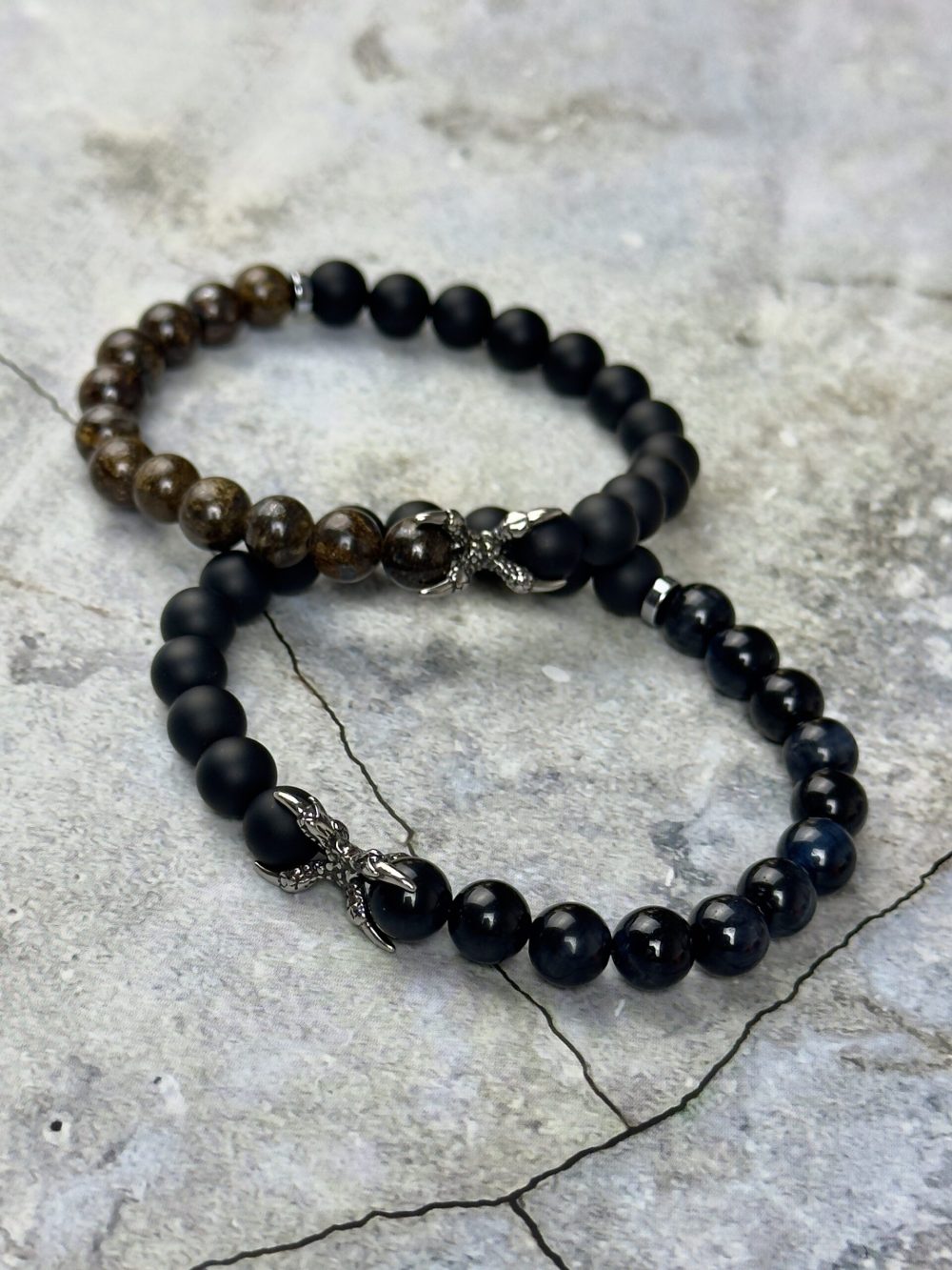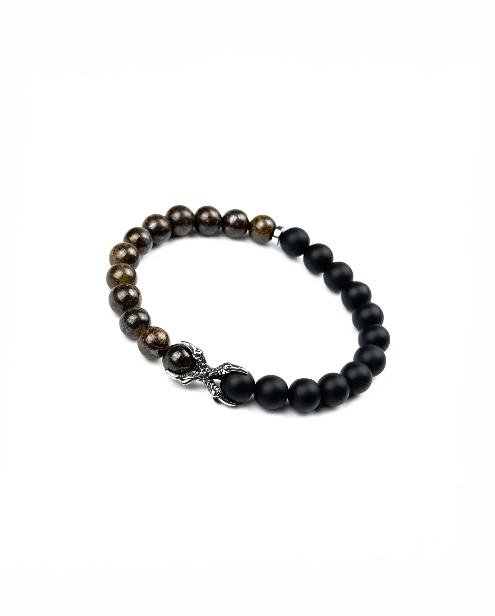 Браслет выполнен из натуральных камней – бронзита и черного матового агата и дополнен харизматичной вставкой из нержавеющей стали в виде когтей орла.