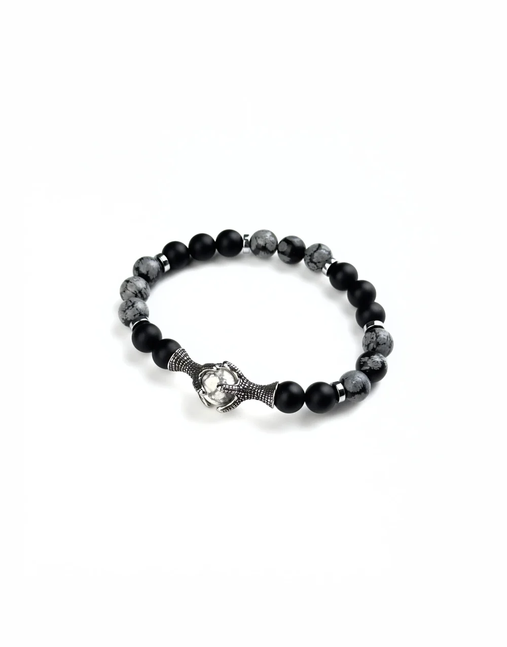 Это уникальное украшение, вдохновленное магией и величием драконов. Он изготовлен из натуральных камней: снежного обсидиана, черного матового агата, гематита и магнезита, каждый из которых обладает своими особыми свойствами.