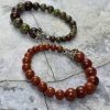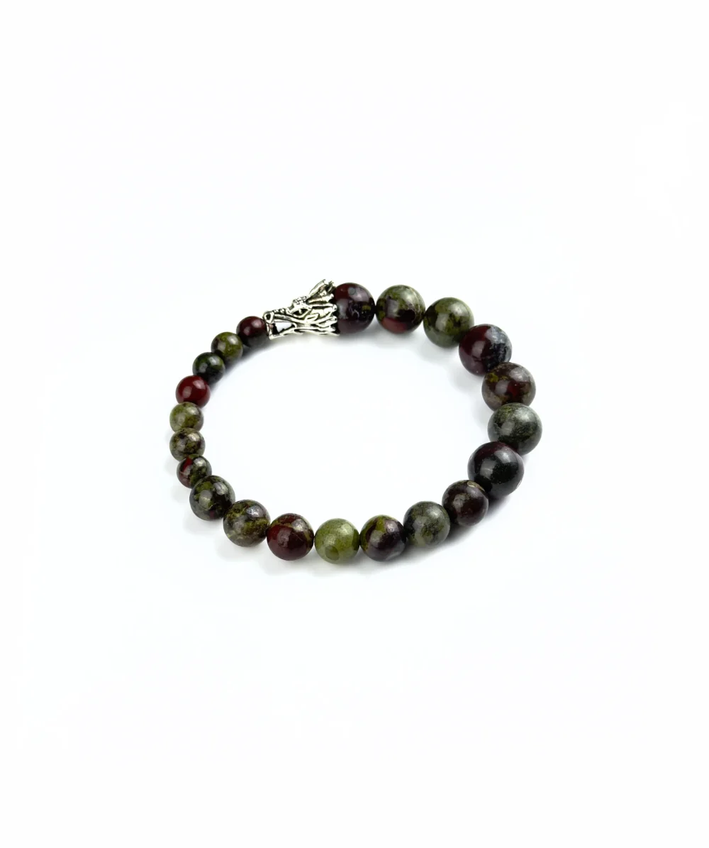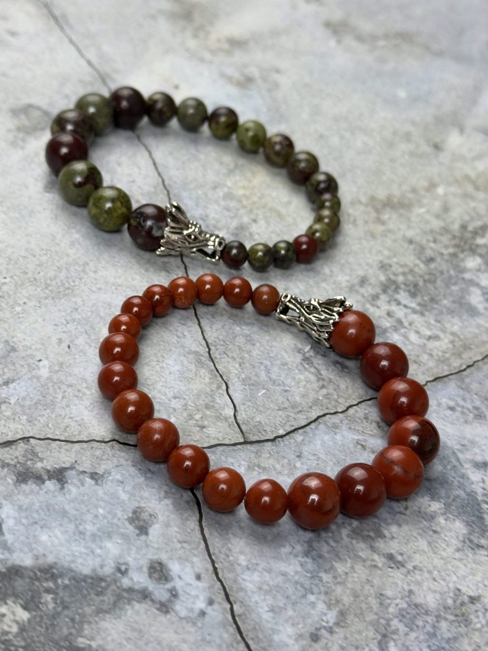 Браслет выполнен из натурального камня яшма Кровь Дракона и дополнен харизматичной вставкой в виде головы дракона.