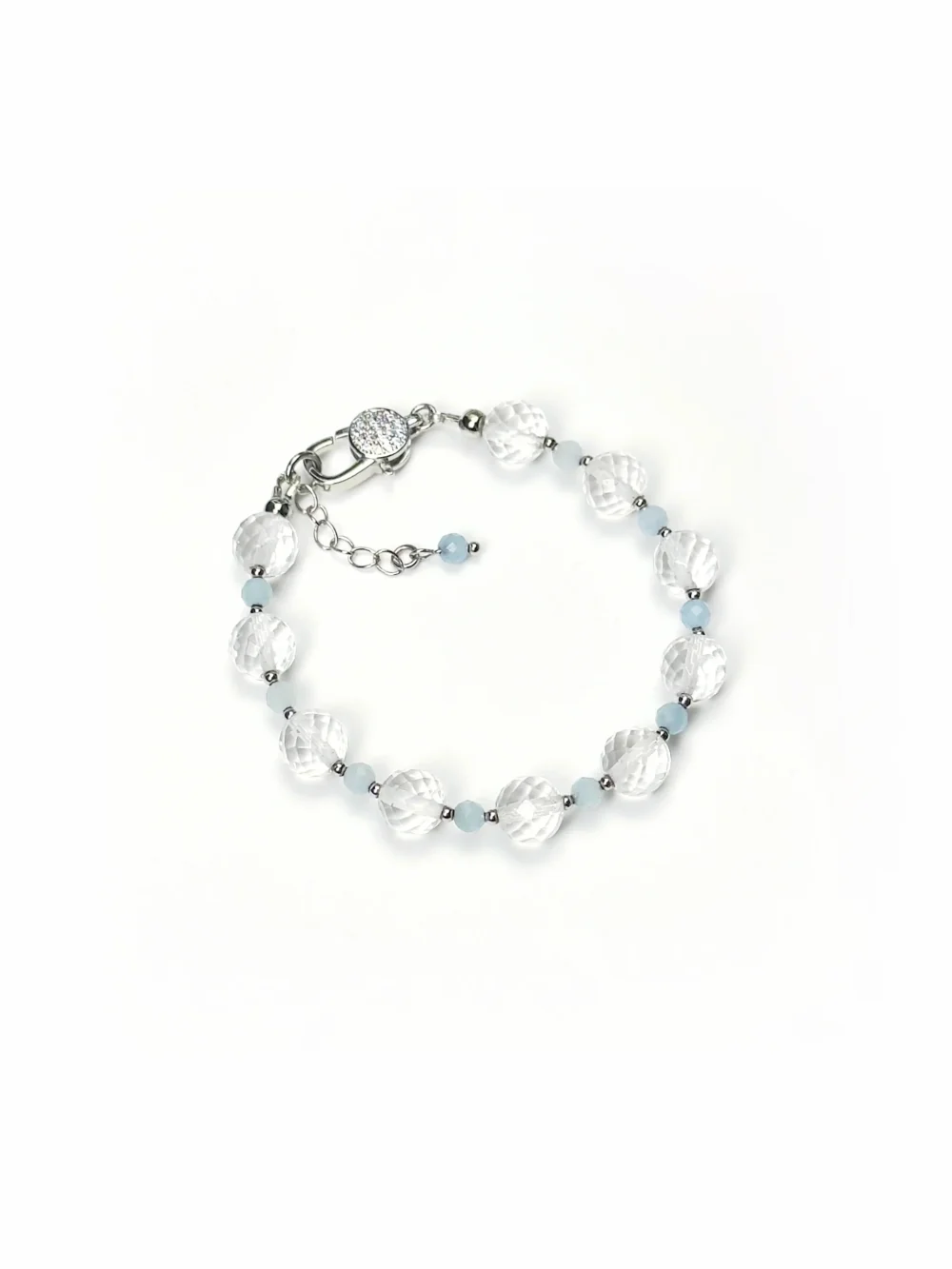 Браслет ЛЕДЯНОЙ ПОЦЕЛУЙ привлекает взгляды своей изысканностью и утонченностью. В нём застыла красота мгновения, когда мороз рисует узоры на стекле. Натуральный горный хрусталь в ювелирной огранке переливается как снежинка в лучах утреннего солнца, а кристаллы аквамарина напоминают капли замерзшей морской воды.