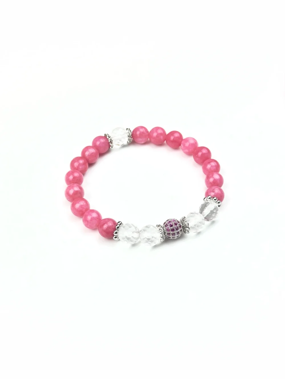 Сочный малиновый кварц, словно спелая ягода, и искрящийся горный хрусталь, словно капли росы на ней. Этот браслет — взрыв радости, воплощенный в камне. Он заряжает оптимизмом и дарит ощущение сладкого предвкушения счастья.