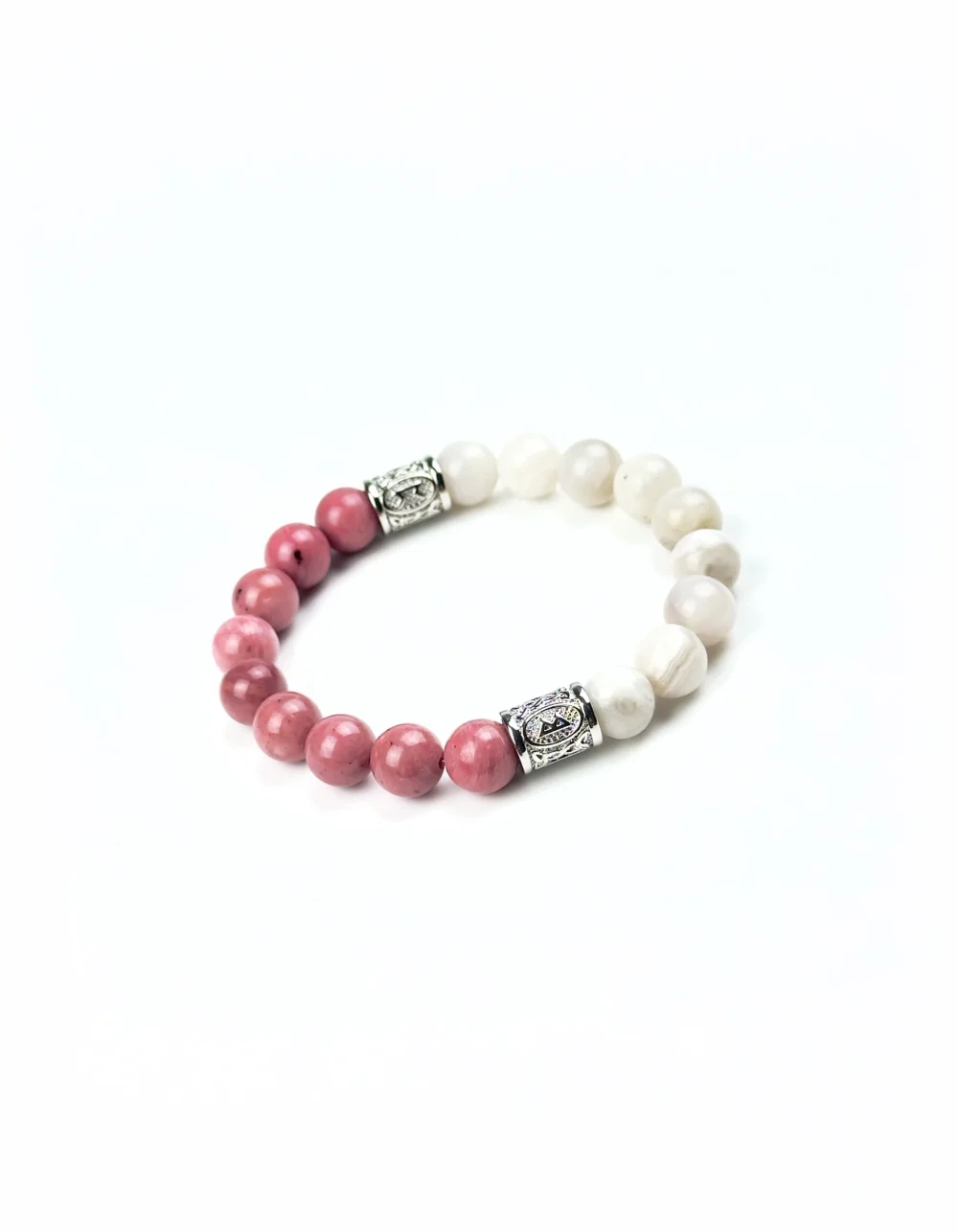 Браслет МАТЕРИНСТВО — это изысканное украшение, созданное из натуральных камней родонита и белого агата. Каждый элемент браслета пронизан любовью и заботой, отражая важность материнства и поддержку семейных ценностей.