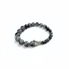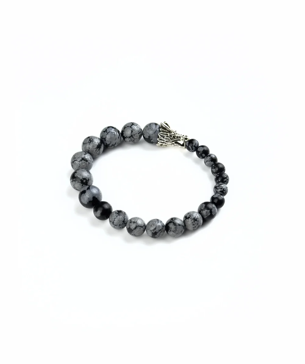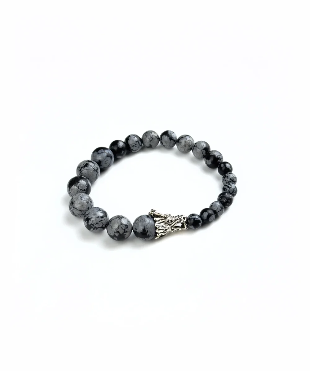 Браслет выполнен из натурального камня снежный обсидиан и дополнен харизматичной вставкой в виде головы дракона.