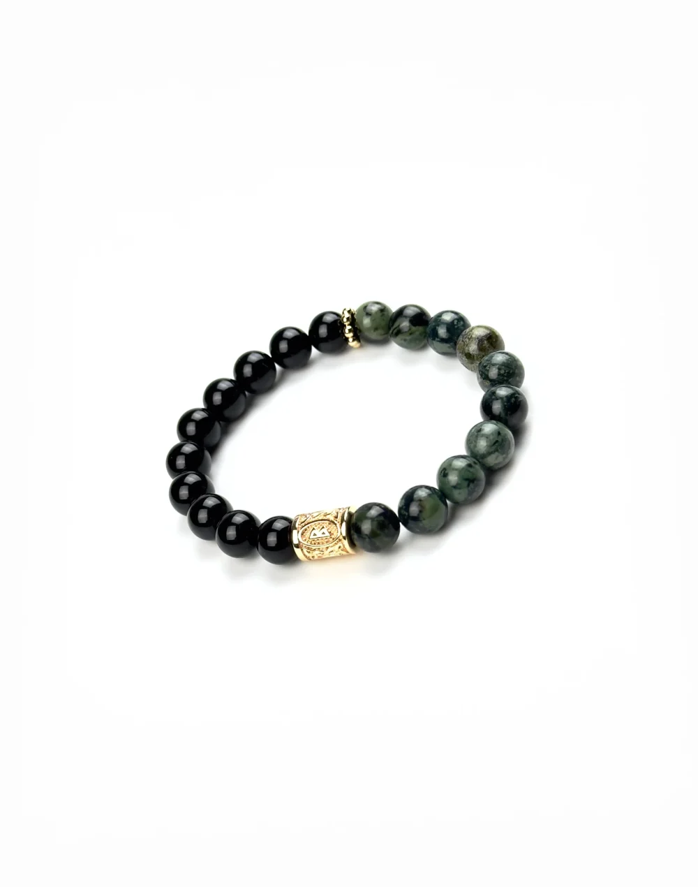 Браслет ПЛОДОРОДИЕ выполнен из натуральных камней, символизирующих изобилие и гармонию. В его основе лежат зеленая яшма и черный агат, которые не только привлекают внимание своим контрастом, но и обладают мощными энергетическими свойствами.