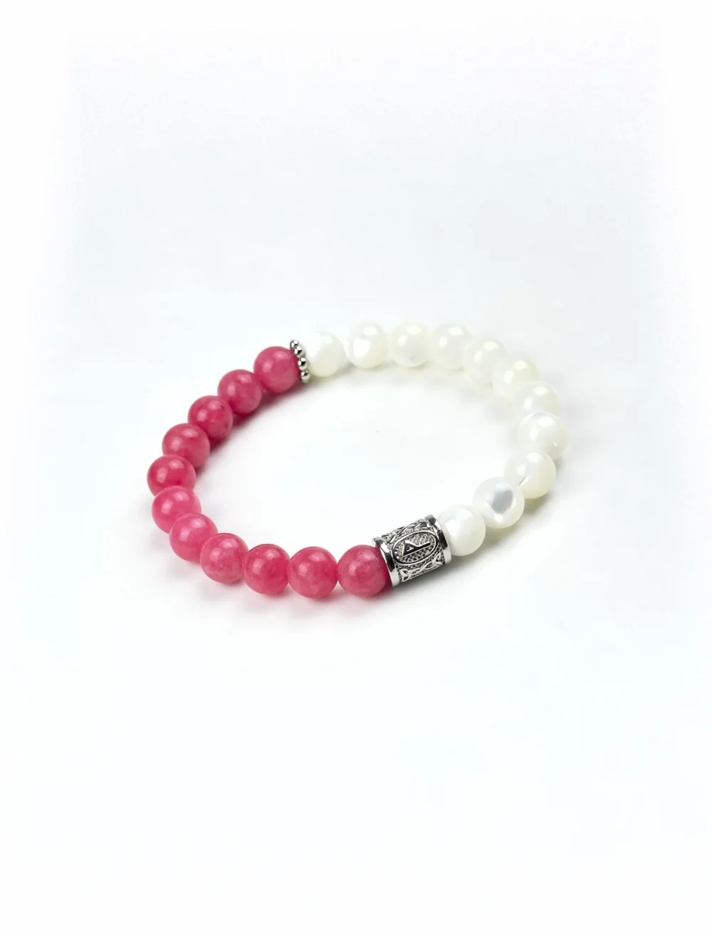Браслет РАДОСТЬ создан из натуральных камней – малинового кварца и перламутра, наполняющих энергией счастья и гармонии.