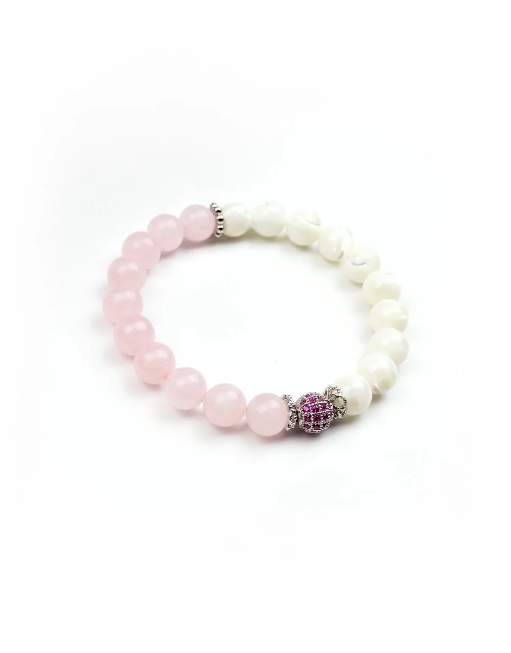 Как воздушный десерт из розового кварца и перламутра — этот браслет тает на запястье нежным облаком. В его палитре — кремовая нежность розового кварца, переливы перламутра, напоминающие сахарную глазурь, и кристаллики розовых фианитов, словно сладкие крупинки малиновой пудры, рассыпанные по поверхности изысканного десерта.