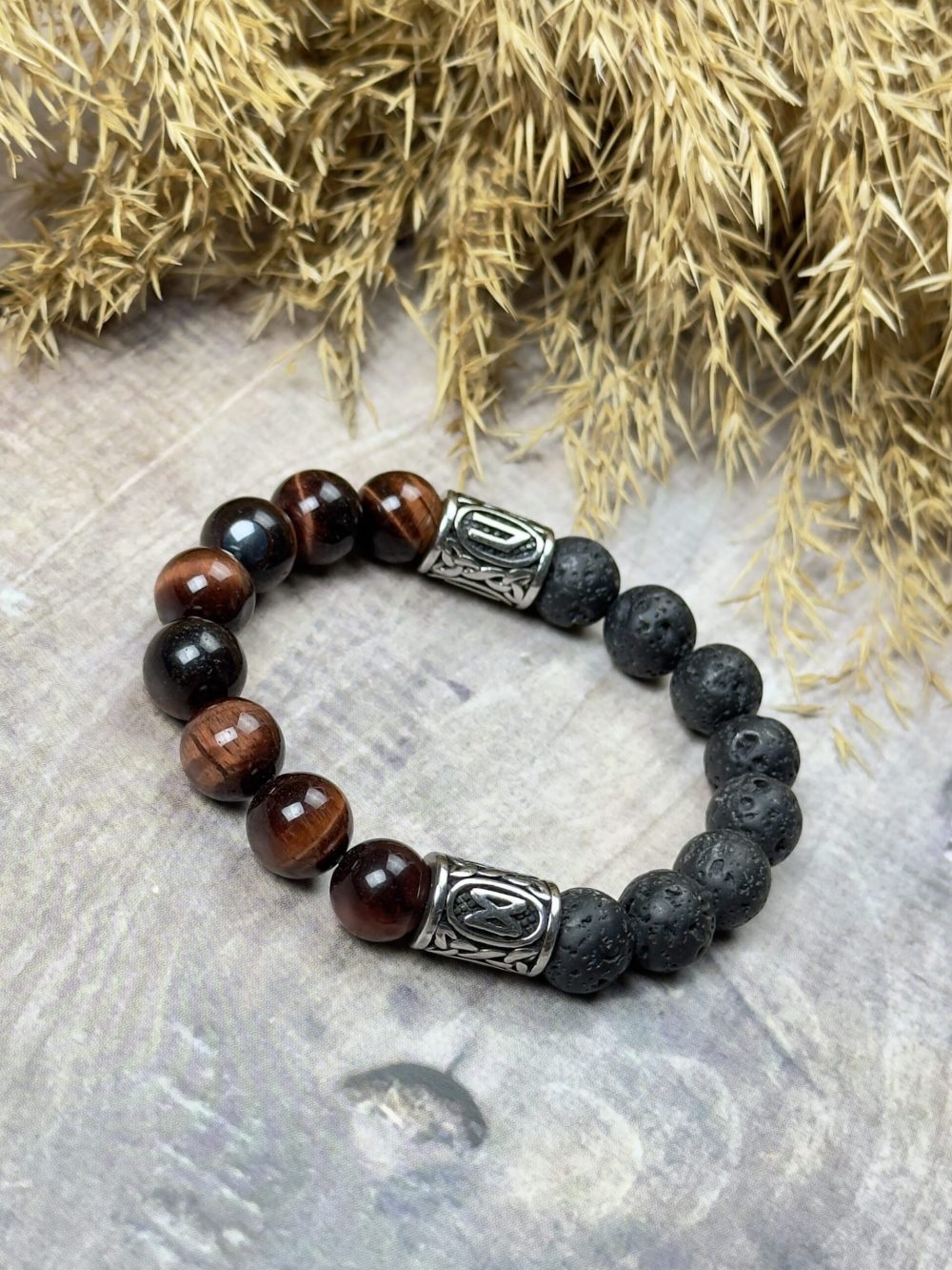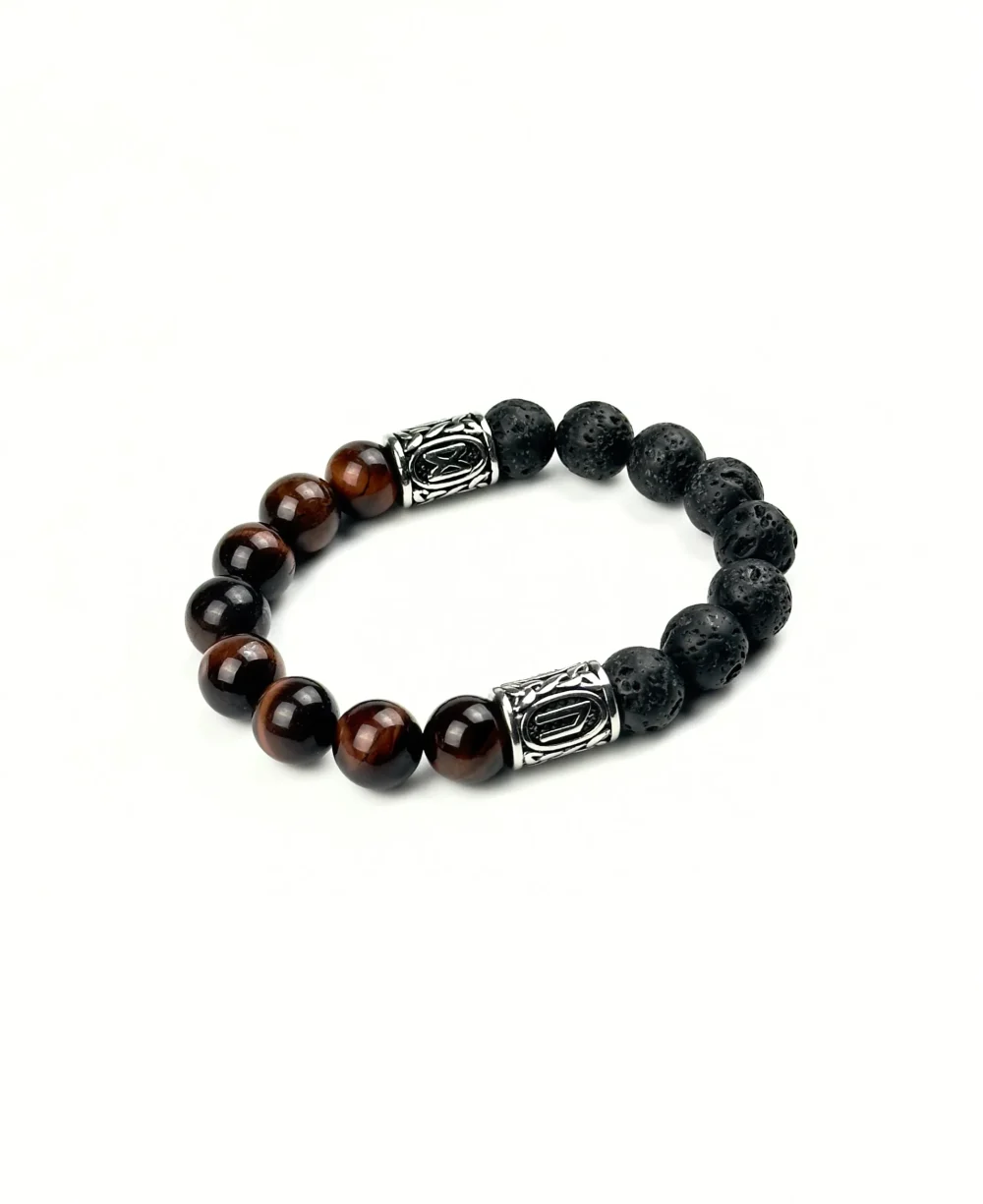 Браслет СИЛА СВЕТА выполнен из натуральных камней – красного тигрового глаза (бычьего глаза) и вулканической лавы и дополнен рунами Уруз и Дагаз из нержавеющей стали. Этот уникальный аксессуар не только эффектен, но и наполнен мощной энергетикой, способной поддерживать вас на пути к личностному росту и внутреннему пробуждению.