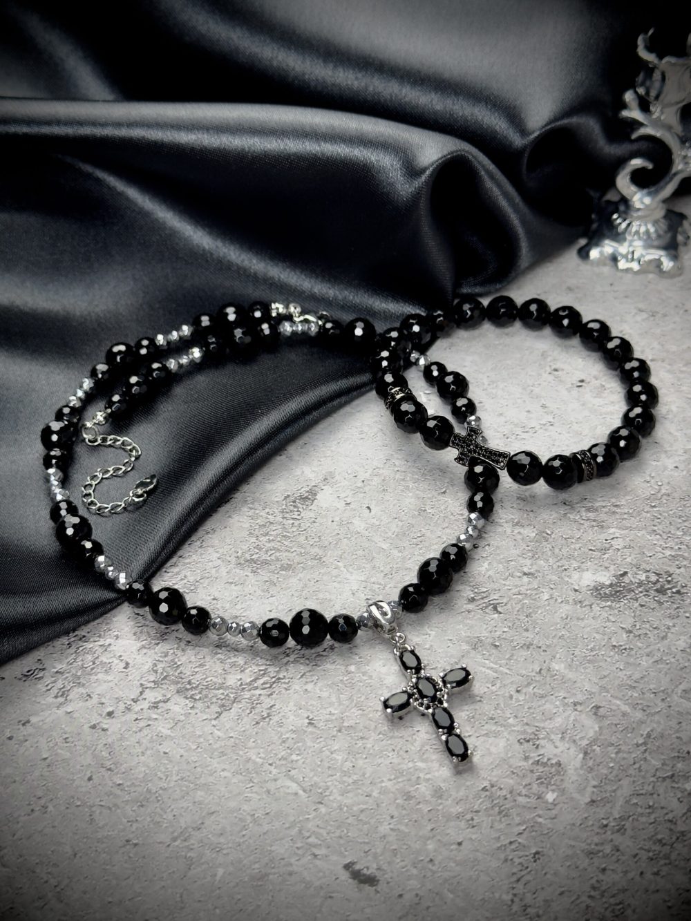 Браслет СИЯЮЩИЙ КРЕСТ — эффектное украшение, выполненное из натурального черного агата в сверкающей огранке. Это камень-защитник, дарящий незыблемое спокойствие и опору.