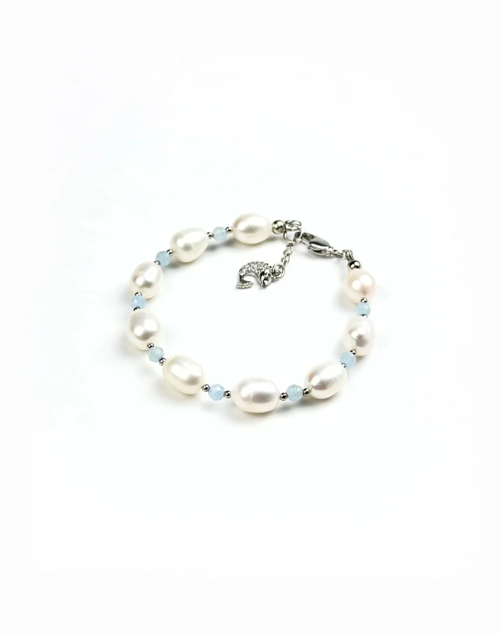 Браслет сочетает в себе элегантность натурального жемчуга и свежесть аквамарина.