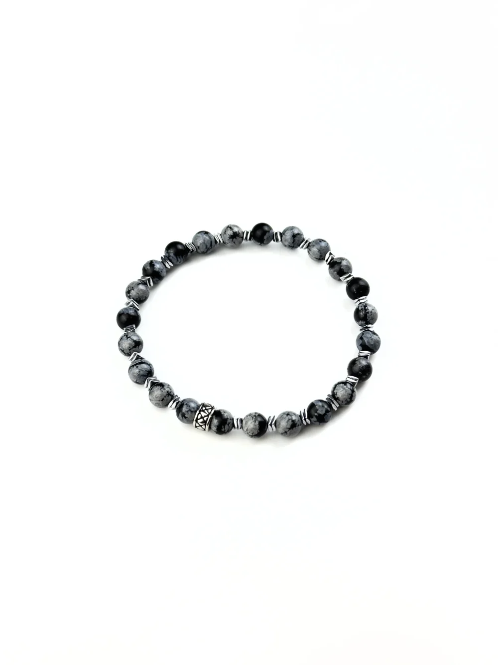 Снежный обсидиан с его выразительным графическим узором и гематит с металлическим блеском. Два камня, объединенные идеей защиты и целеустремленности.