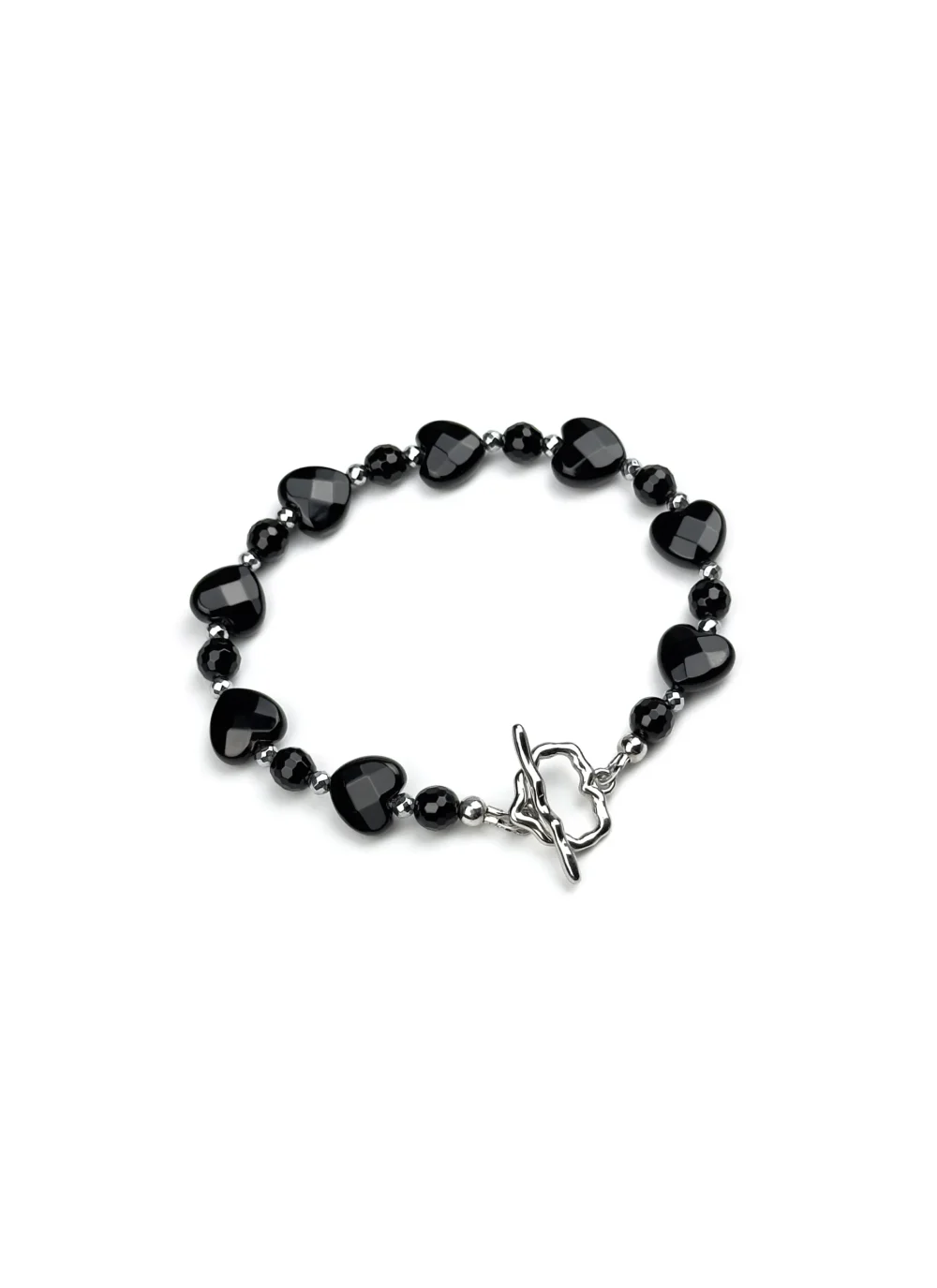 Чёрный агат в сияющей огранке и гематит с его холодным стальным блеском. Два камня, сплетенные в диалоге контраста: таинственная ночная тьма и дерзкий вызов металла.
