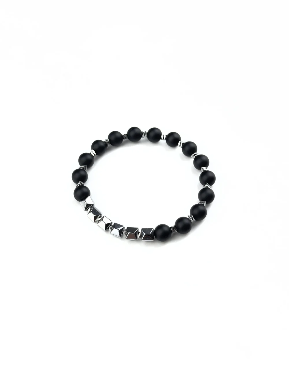 Черный матовый агат, поглощающий свет, и гематит с его металлическим блеском. Эффектный контраст стихий: бархатная глубина и стальная твердость.
