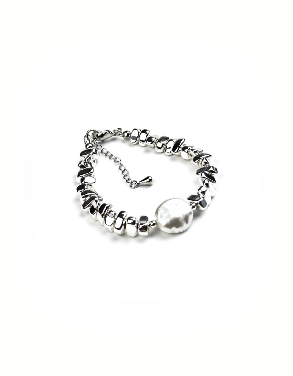 Гематит с холодным стальным блеском и барочная жемчужная монетка из нежной майорки. Два начала: стальной блеск и мягкое сияние.