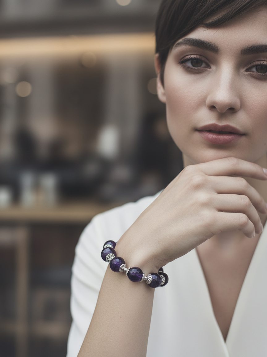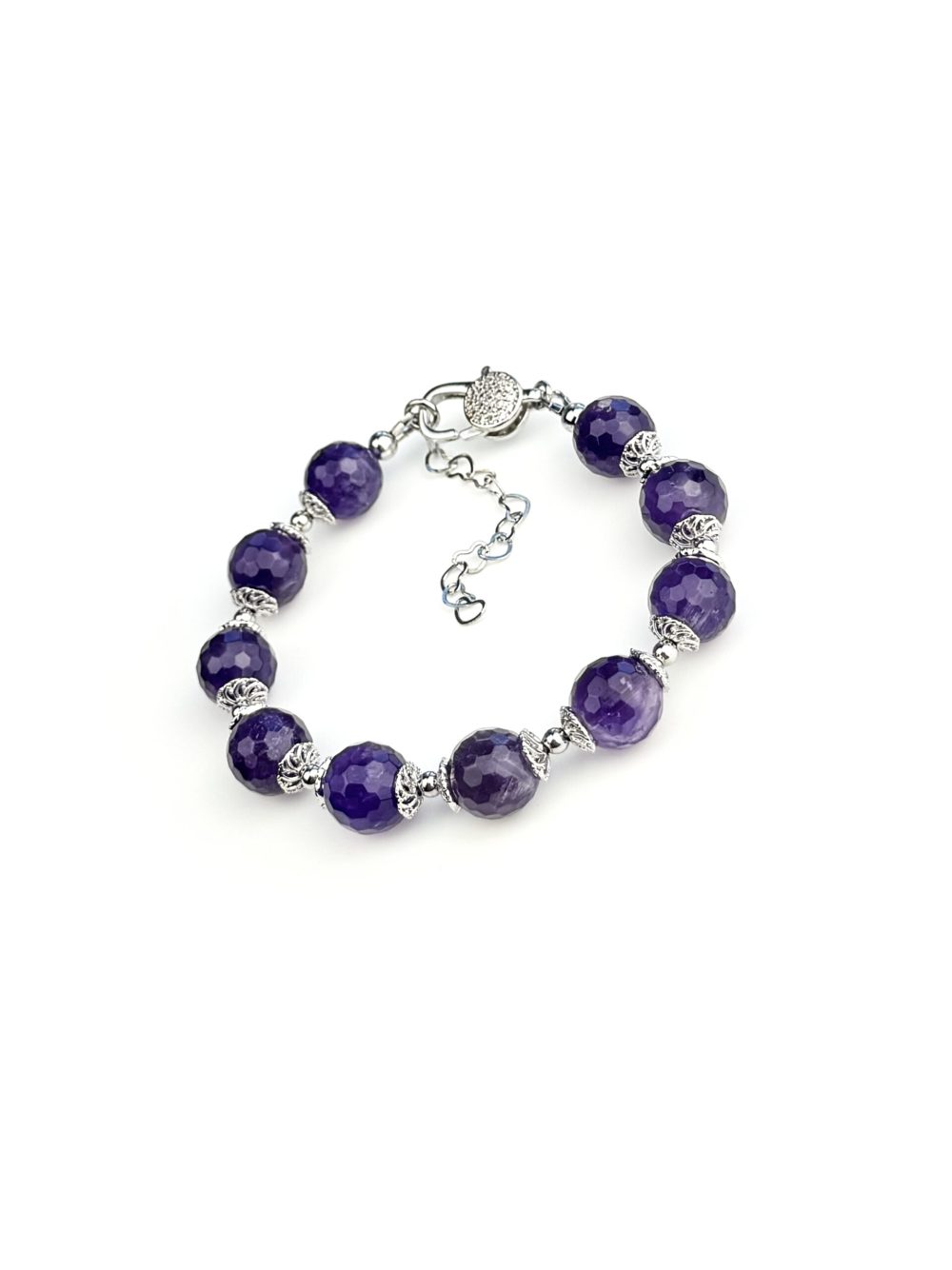 Этот браслет словно воплощение тайны, подобно первым проблескам лунного света. Аметист, из которого он создан, словно сгусток сумеречного неба, несет в себе умиротворение завершающегося дня и мудрость наступающей ночи. Его холодное сияние подчеркивает изысканный замок, инкрустированный россыпью фианитов. Они вспыхивают, словно первые, самые яркие огни города, зажигающиеся в сумерках. Это не просто деталь — это кульминация, тихая драма света, побеждающего тьму.
