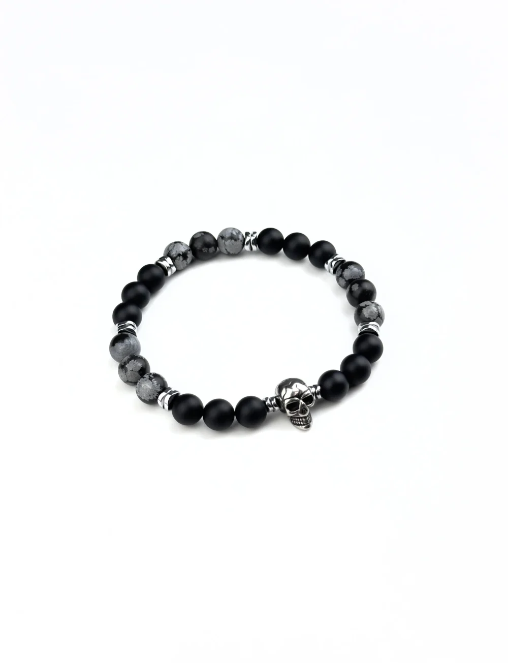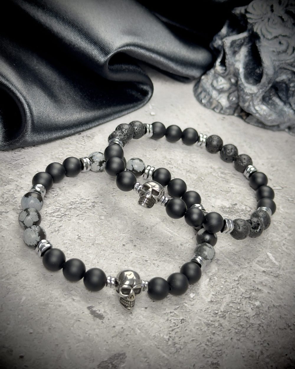 Обсидиан остужает мысли, лава даёт опору в переменах, гематит оттачивает волю. Череп из нержавейки — не угроза, а напоминание: истинная смелость рождается из принятия всех граней бытия.