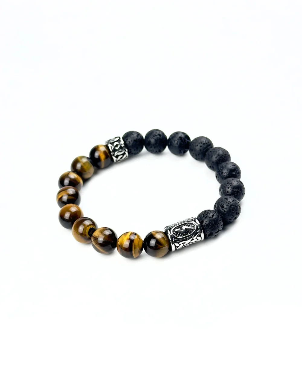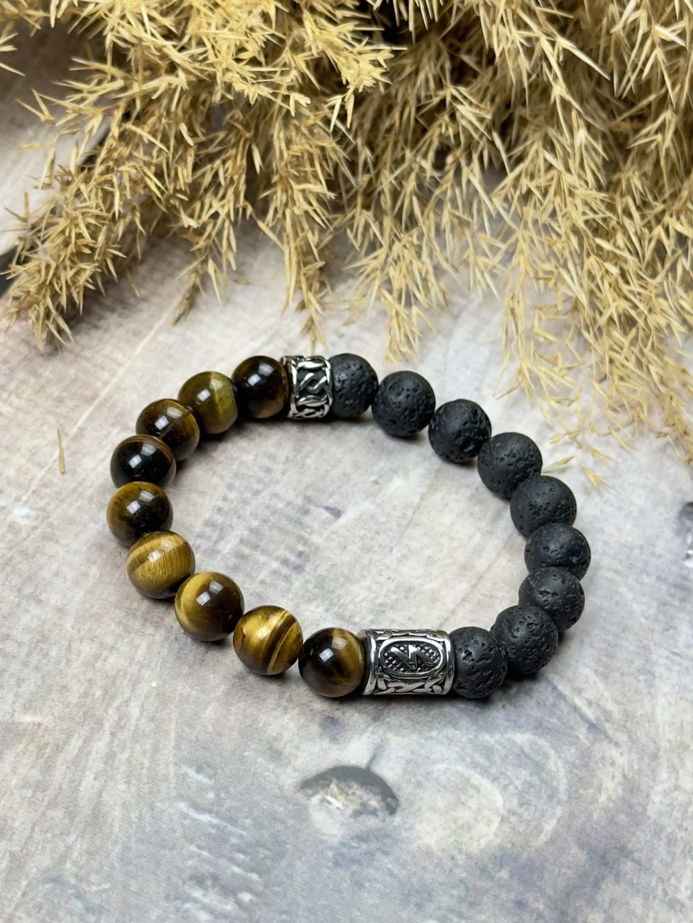Браслет УСПЕХ выполнен из натуральных камней – тигрового глаза и вулканической лавы с руной Соулу из нержавеющей стали. Этот браслет создан для тех, кто стремится к новым победам и достижениям.