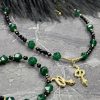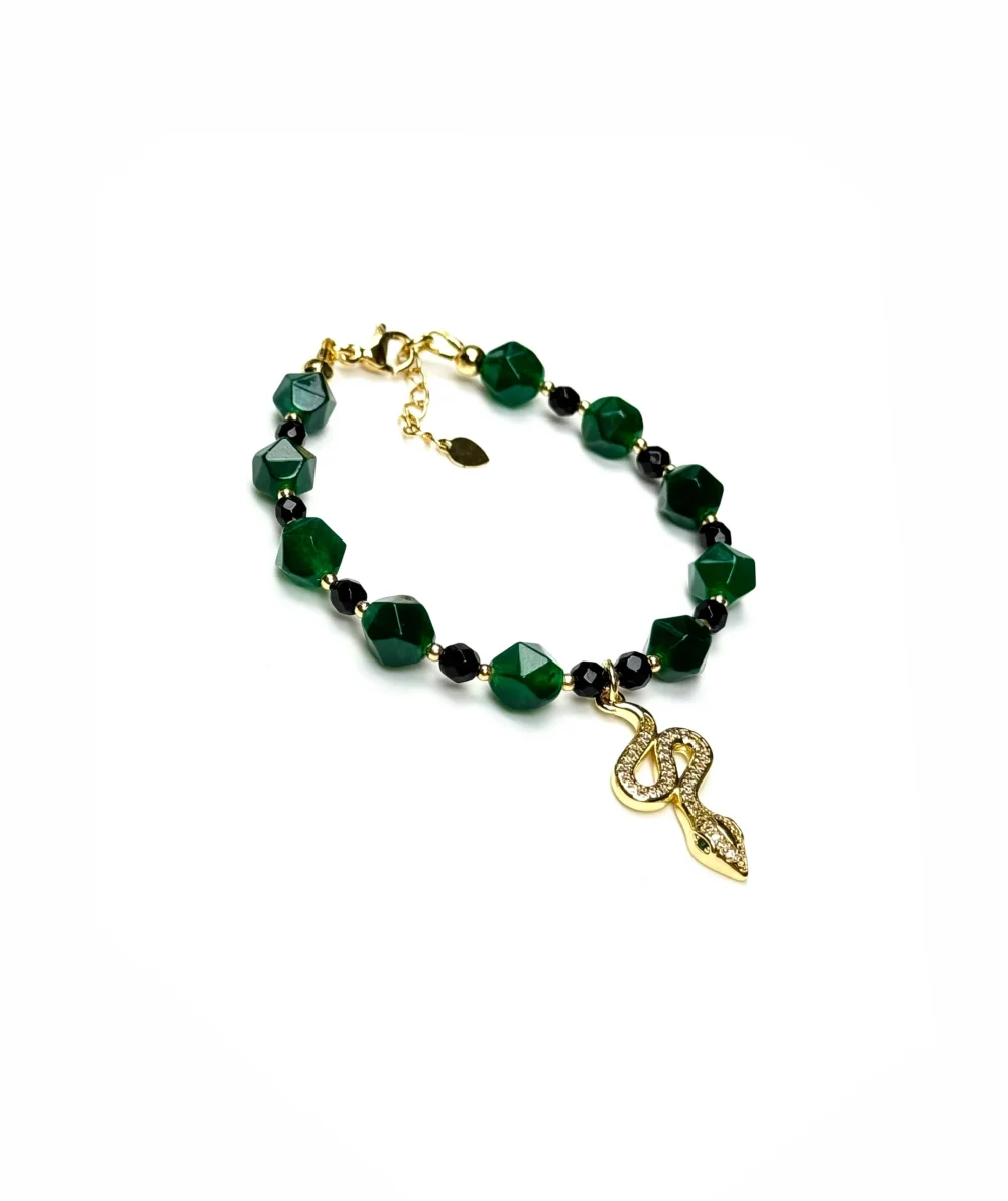 Зелёный агат словно змеиная кожа и чёрный агат, глубокий, как ночь в песках. Их контраст — диалог между жизнью и тайной, воплощённый в камне.