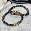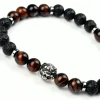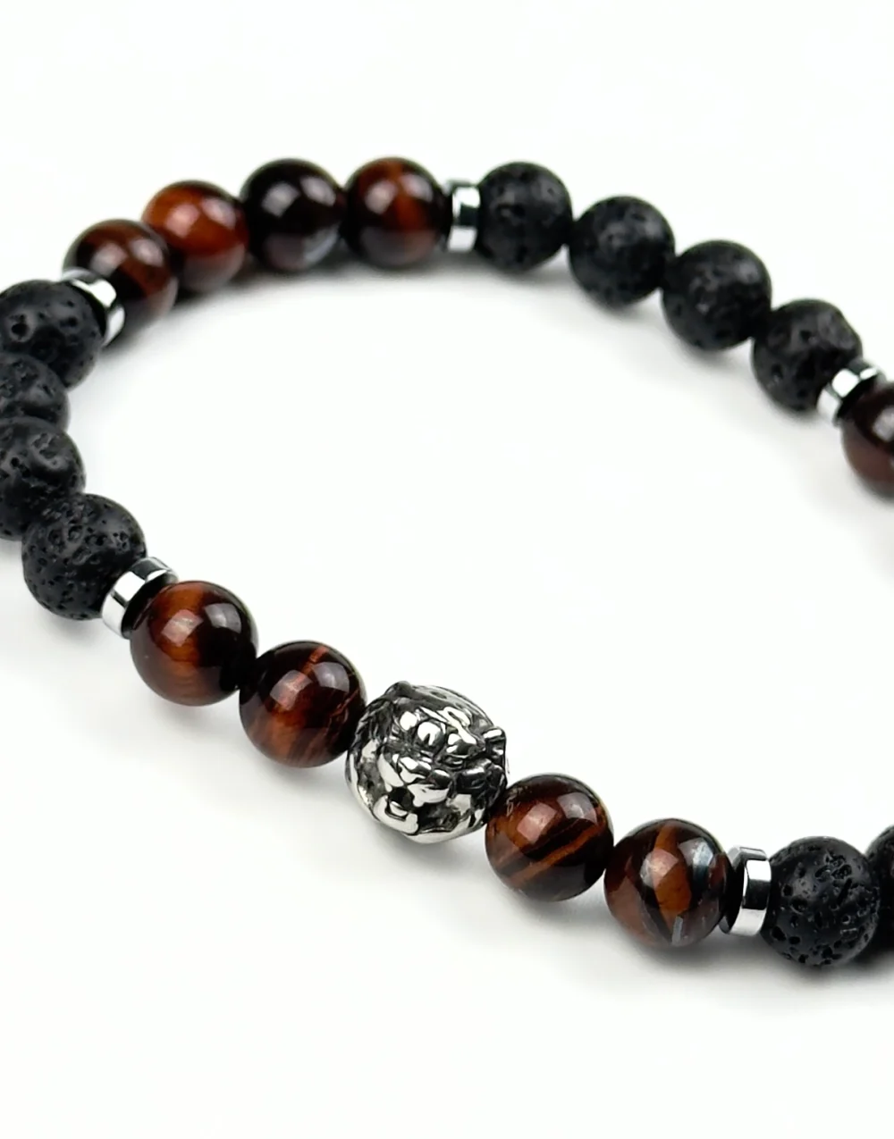 Красный тигровый глаз со своими благородными переливами, вулканическая лава, хранящая огненное дыхание земли, и гематит с холодным стальным блеском. Три стихии, сплетённые в символ неукротимой мощи.