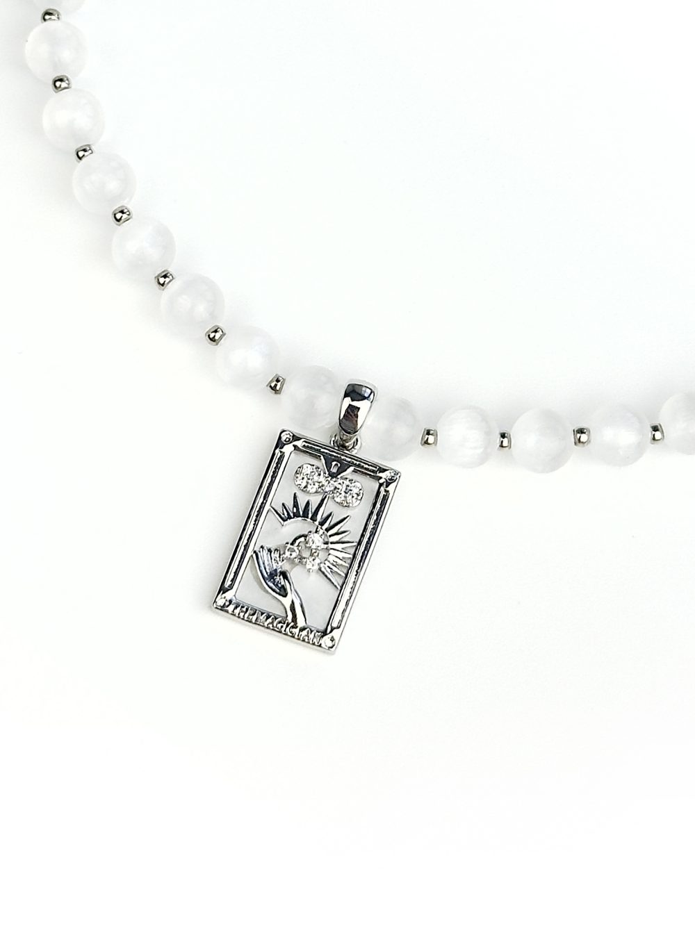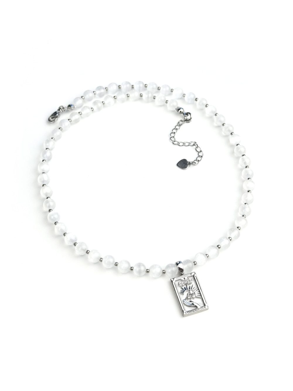 Колье БЕЛЫЙ МАГ — это истинное воплощение волшебства и элегантности. Выполненное из натурального селенита, оно излучает свет и создает ауру мистического очарования.