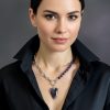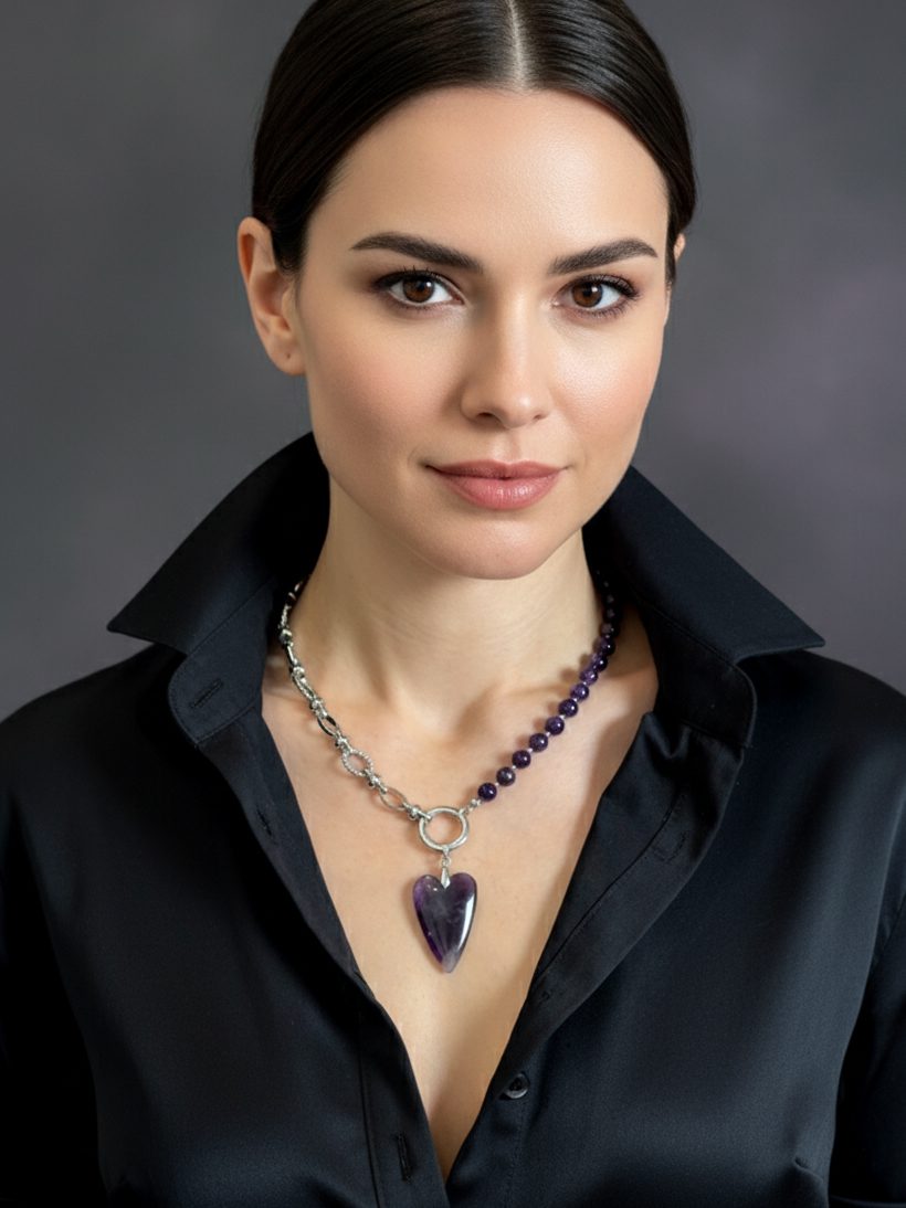 Подвеска в виде большого сердца, также выполненная из натурального аметиста, добавляет в образ эффектности и шика.
