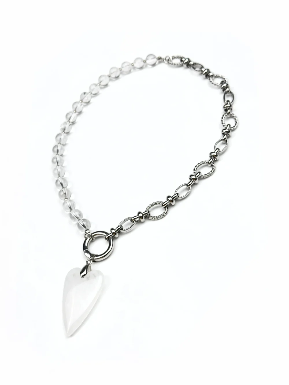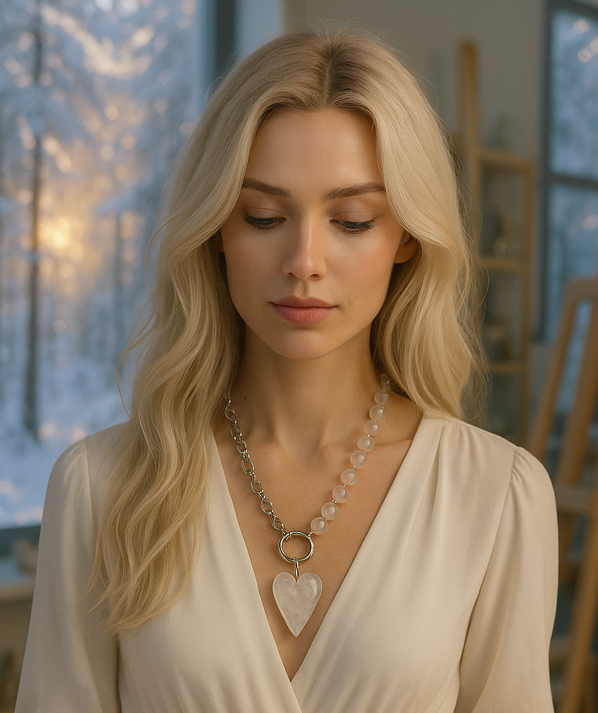 Подвеска в виде крупного сердца, также выполненная из натурального горного хрусталя, добавляет в образ эффектности и шика.