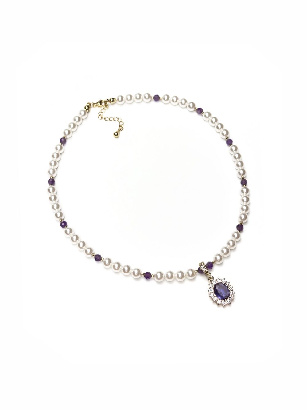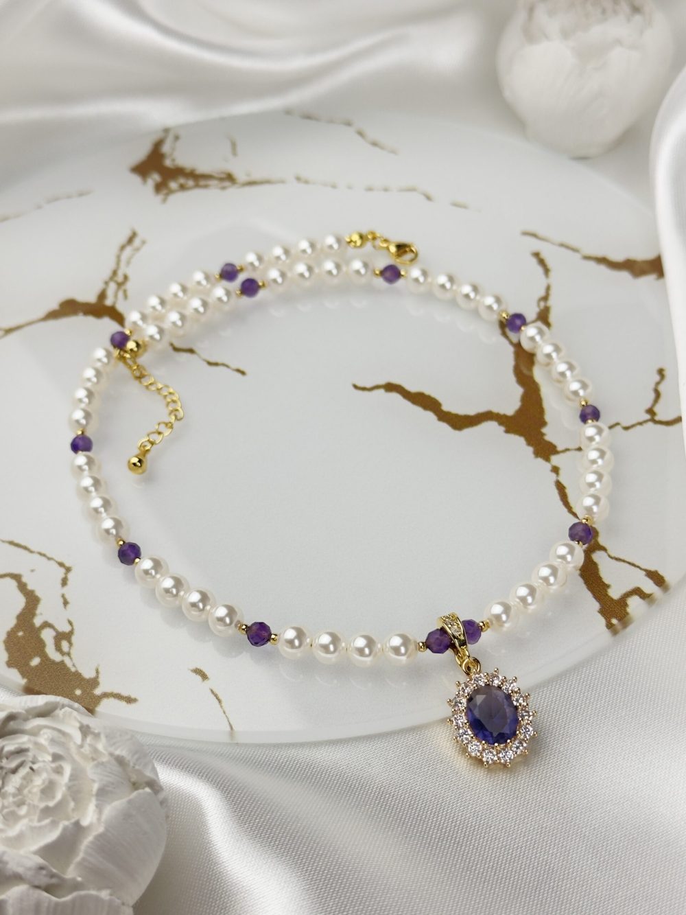 Познайте мир утончённой роскоши с эти изысканным колье, выполненным из жемчуга майорка и натурального аметиста в ювелирной огранке.
