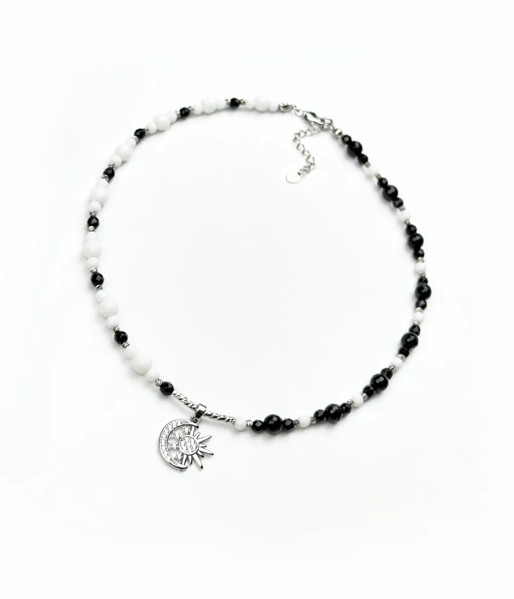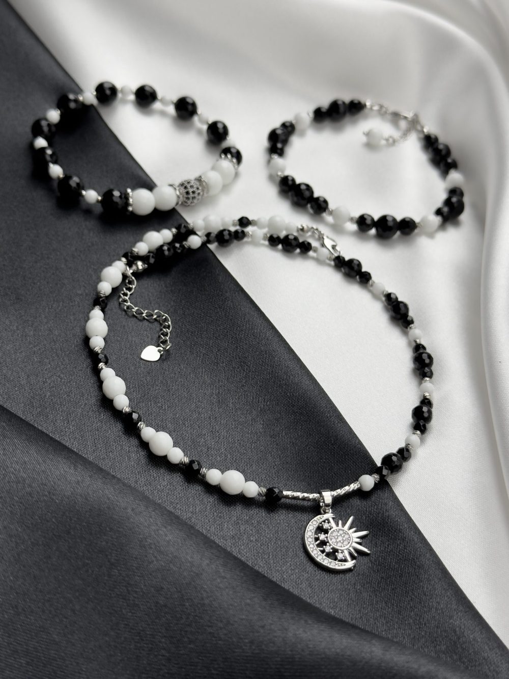Колье ДЕНЬ и НОЧЬ – целый мир, излучающий магию контрастов. Созданный из натурального черного и белого агата, этот аксессуар становится воплощением единства противоположностей.