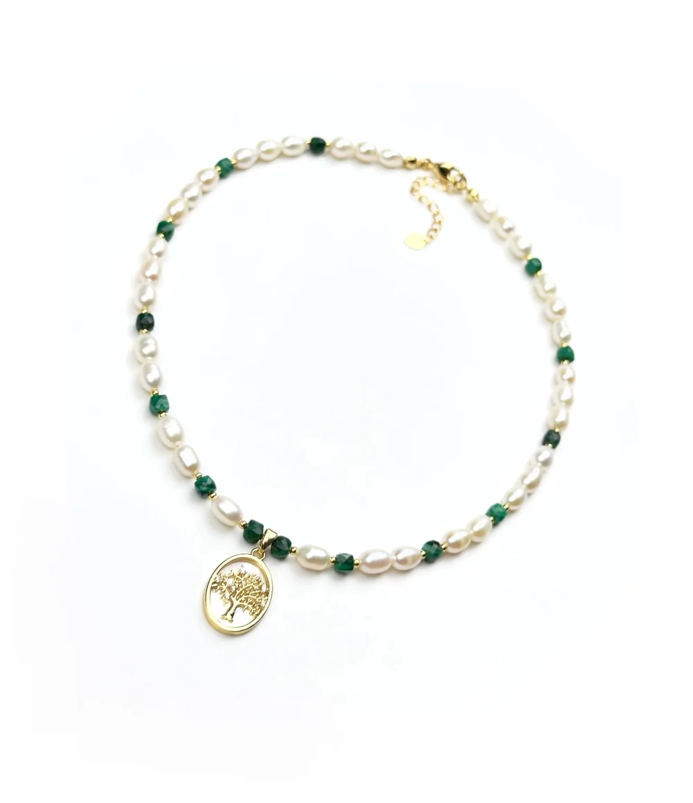 Состав изделия: натуральный жемчуг, малахит в форме кубов в ювелирной огранке, подвеска Дерево жизни с перламутром, инкрустация фианитами