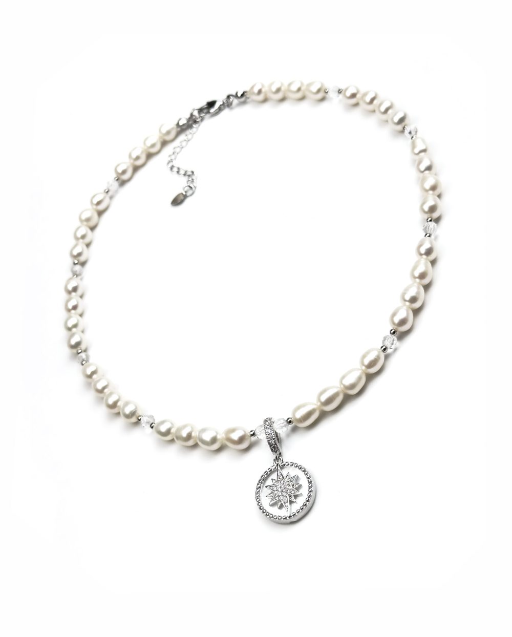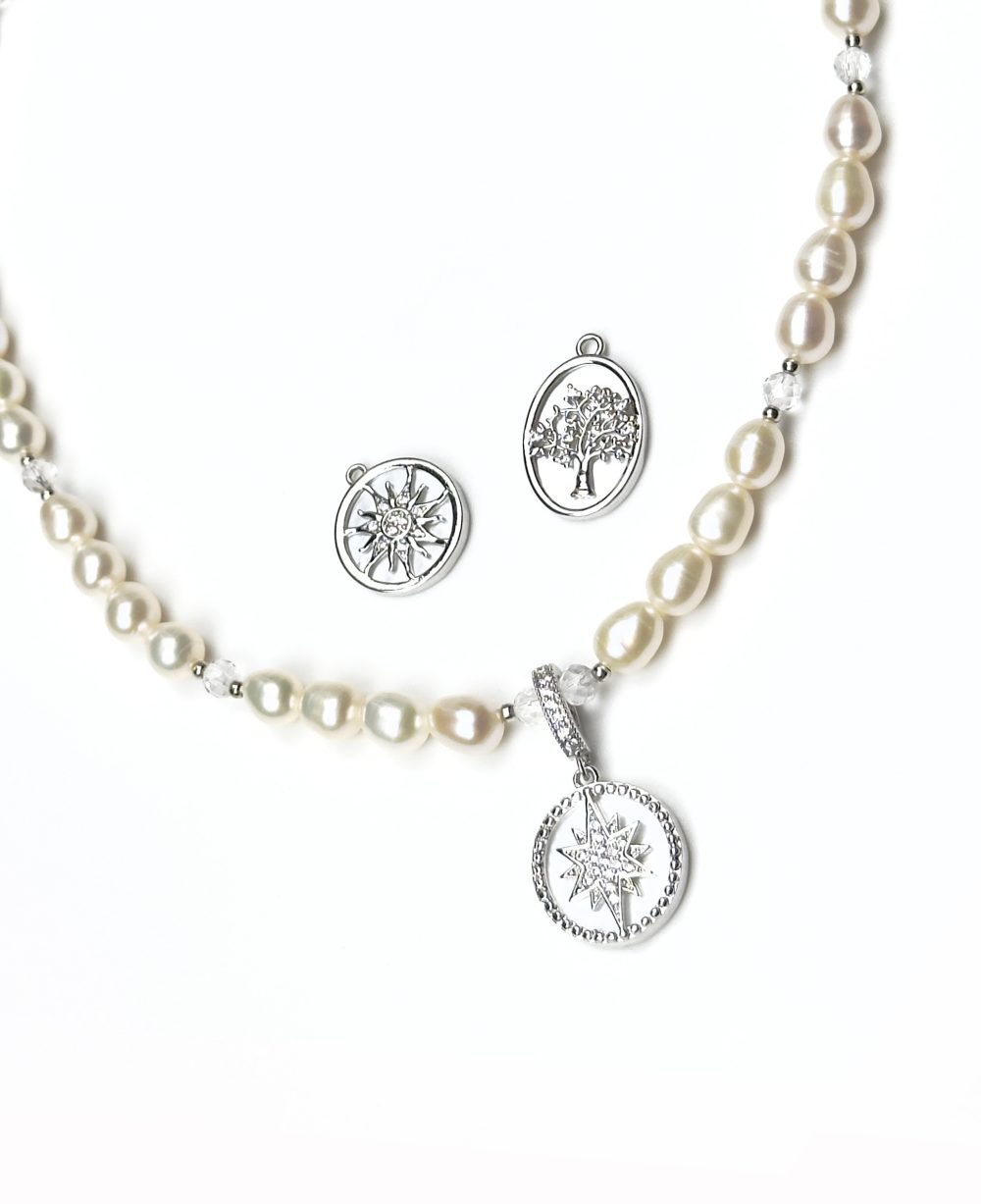 Изюминкой украшения является изящная съемная подвеска с натуральным перламутром на выбор: Звезда, Дерево Жизни, Солнце. Возможность менять подвеску, а также носить колье без подвески позволяет создавать разнообразные образы, адаптируя украшение под любое настроение и стиль.