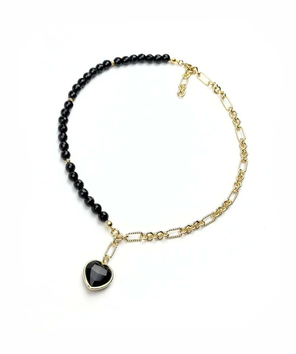 Колье ЗОЛОТОЕ СЕРДЦЕ – это сочетание силы и элегантности, выполненное из натурального черного агата в сверкающей огранке, который в сочетании с позолоченной цепью создает эффектный контраст, подчеркивающий уникальный стиль обладательницы.