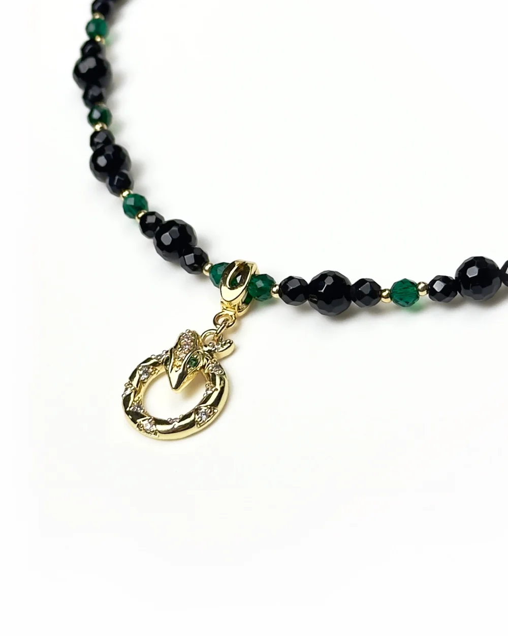 Состав изделия: черный агат в огранке, зеленая шпинель (искусственно выращенная), подвеска в виде змейки с зелеными фианитовыми глазками