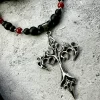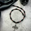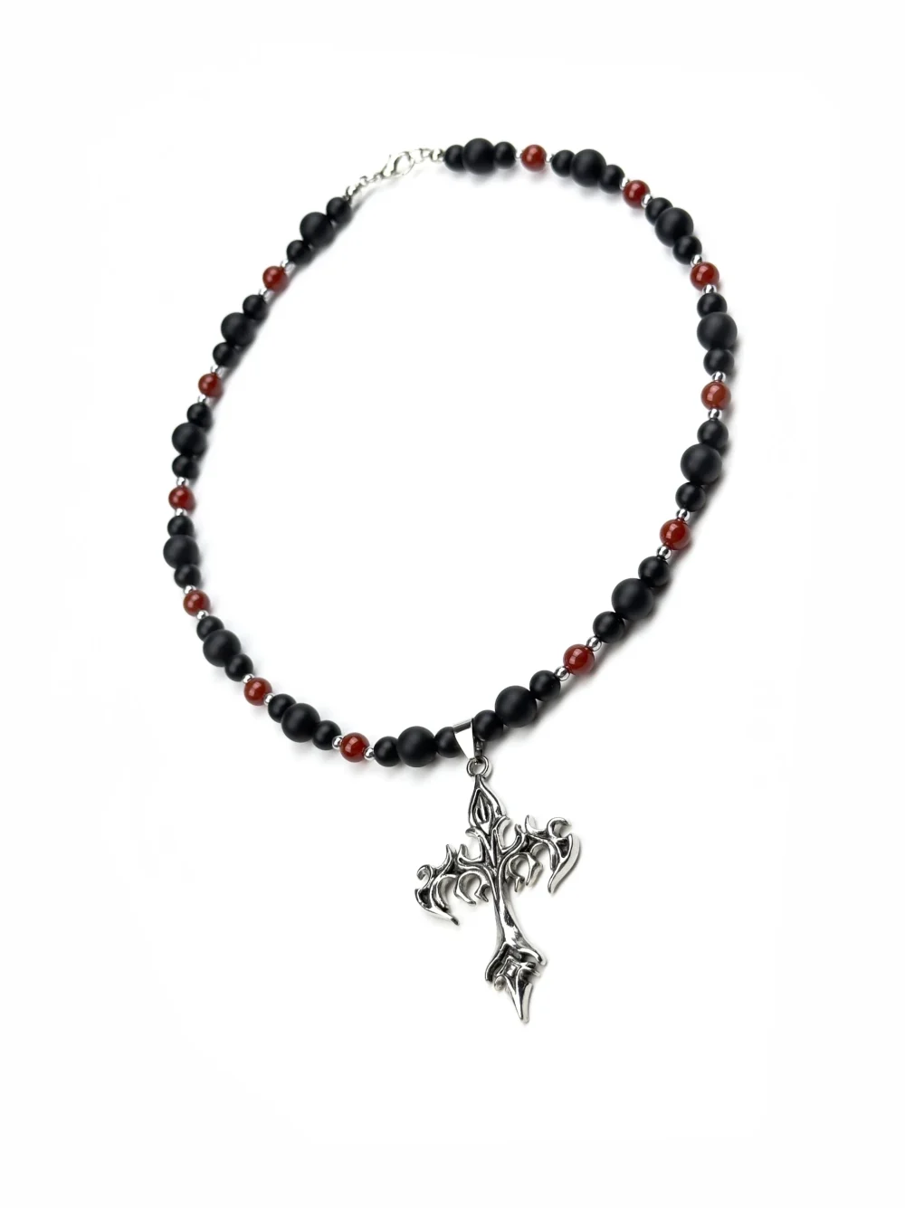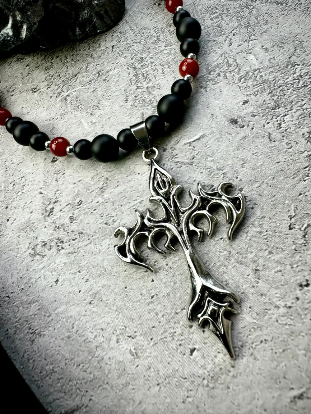 Колье КРЕСТ – это мощное и выразительное украшение, выполненное из натуральных камней: черного матового агата, алого сердолика и гематита.