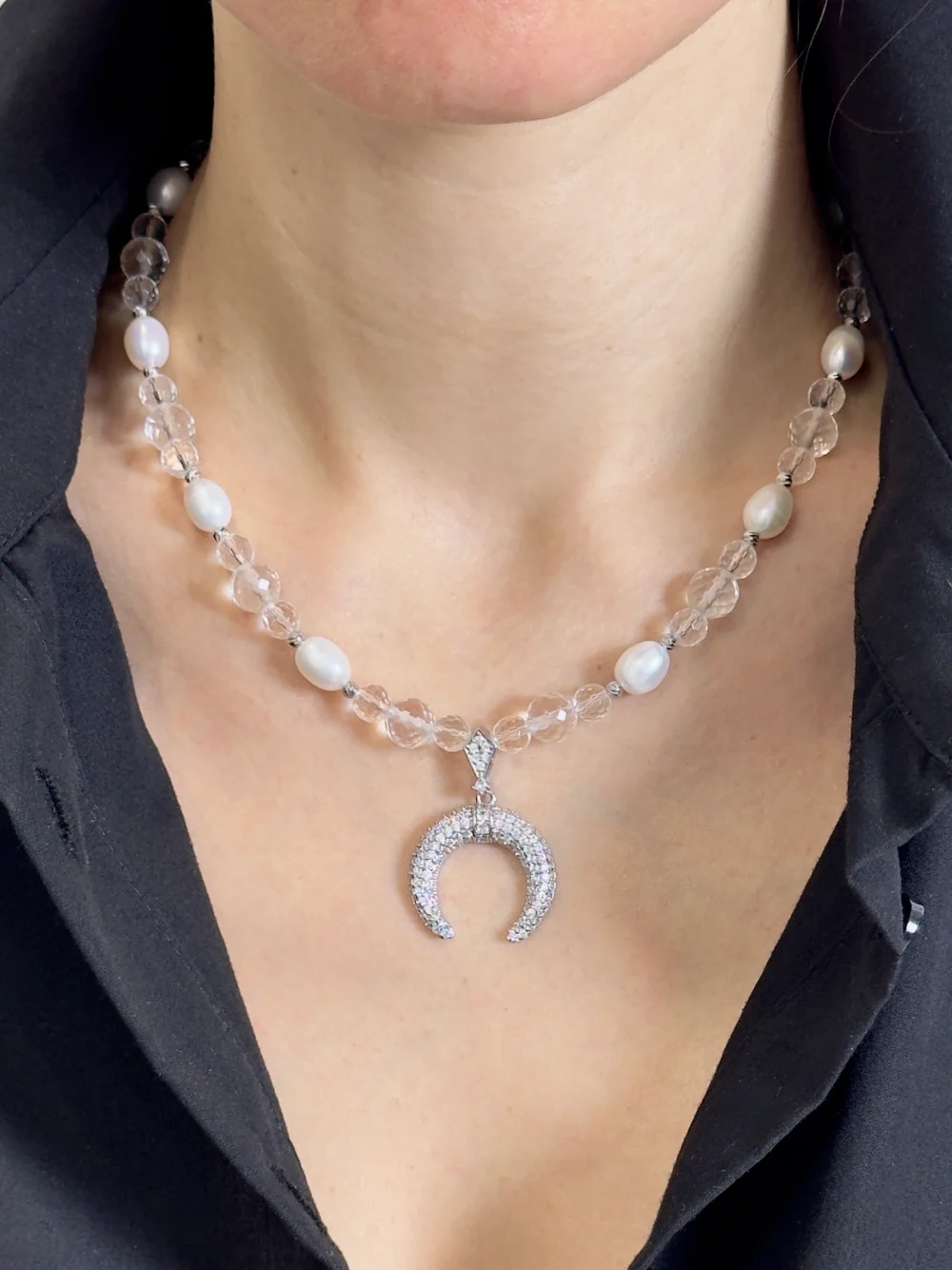 Каждая жемчужина, словно капля лунного света, а бусины горного хрусталя сияют и искрятся, как звезды на бескрайнем небосклоне.