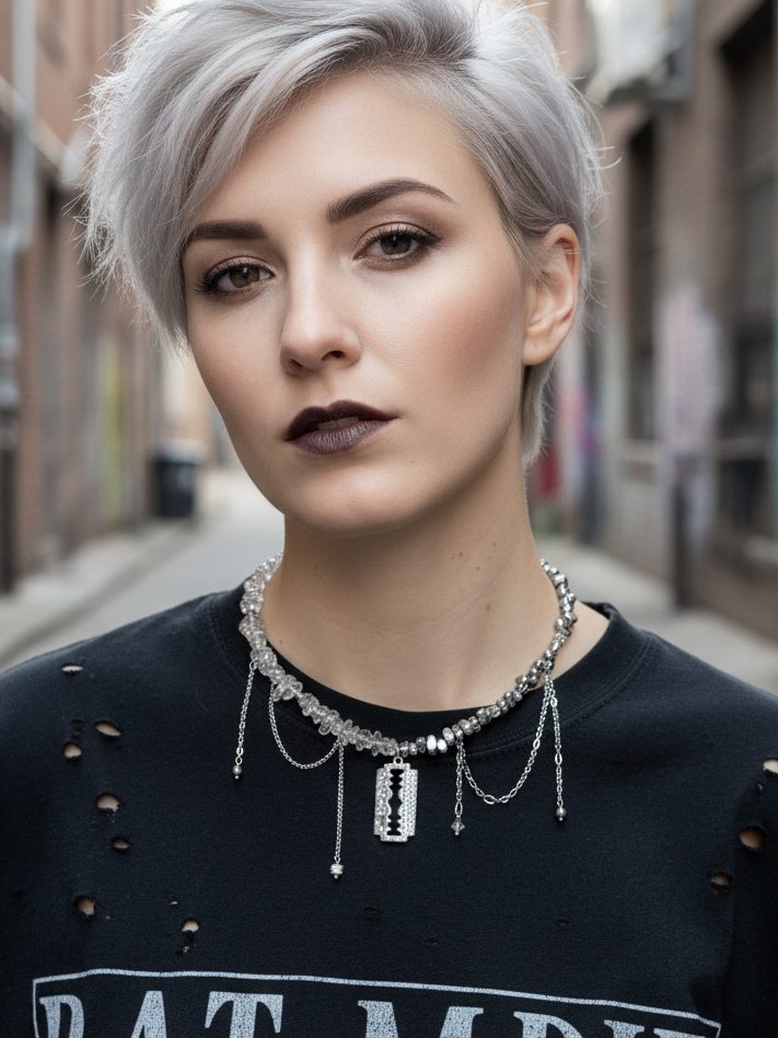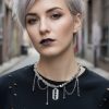Колье дополнено изящными цепями, которые привносят в образ особый шарм. Выразительная подвеска в виде бритвы усиливает дизайн, намекая на смелость и бесстрашие обладательницы.
