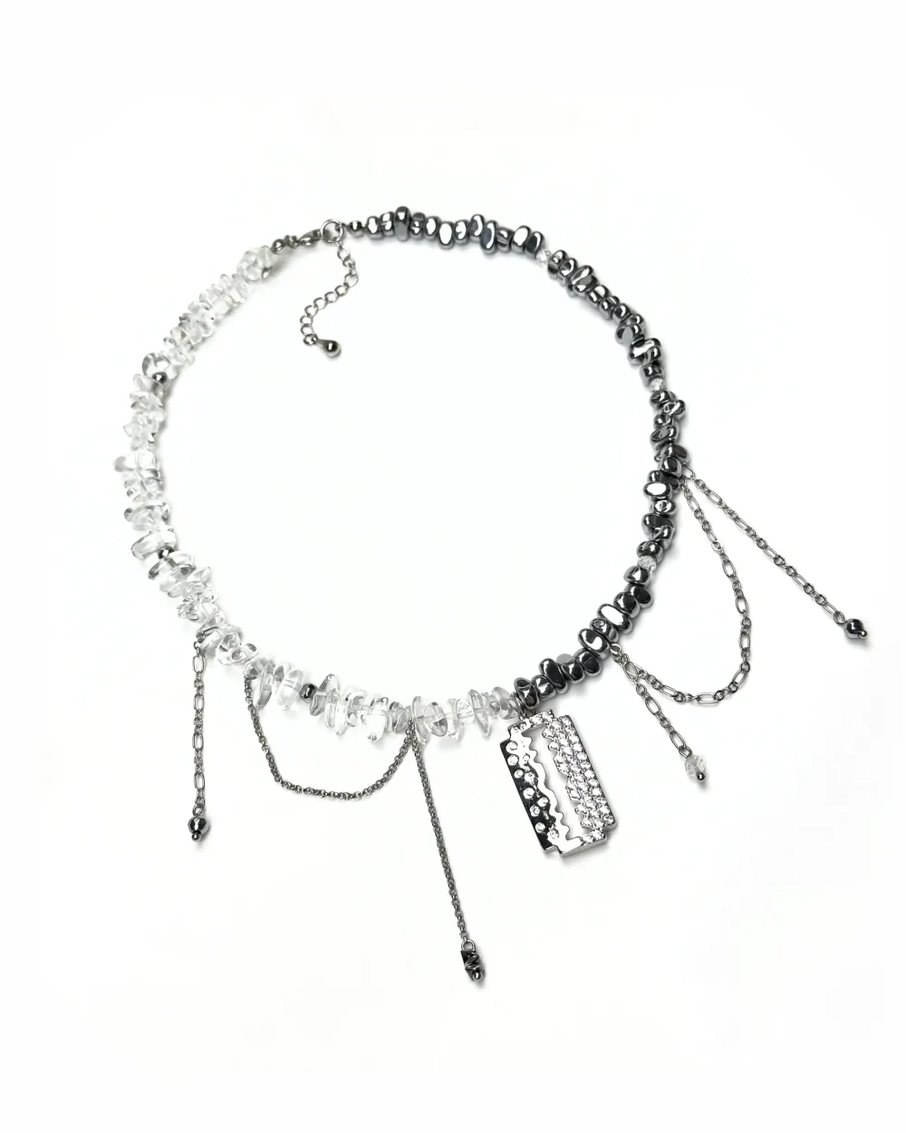 Добавьте в образ немного дерзости и остроты с нашим колье НА ЛЕЗВИИ, которое сочетает в себе силу и уверенность гематита и нежное сияние горного хрусталя.