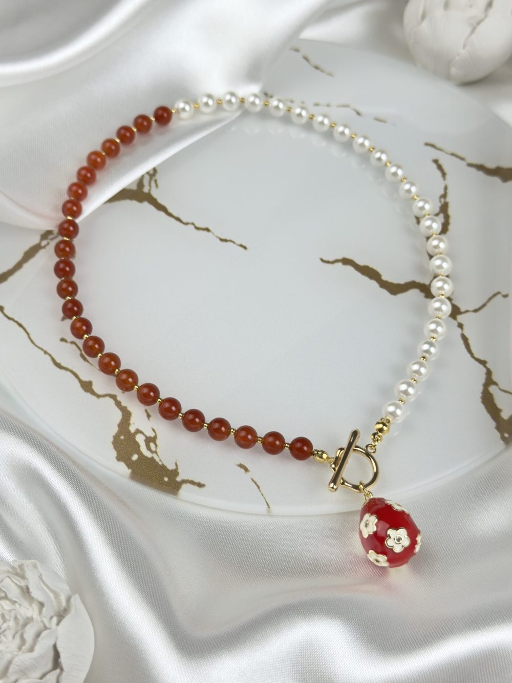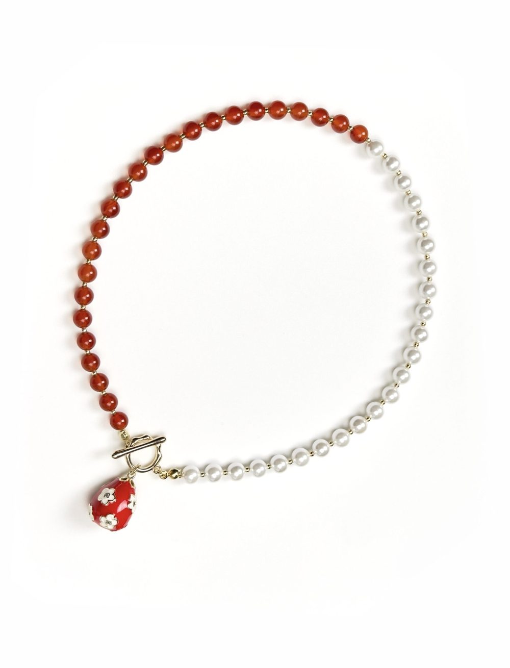 Состав изделия: сердолик, жемчуг майорка, замок-тогл (в ассортименте), подвеска Пасхальное яйцо в алом цвете, инкрустированная фианитами