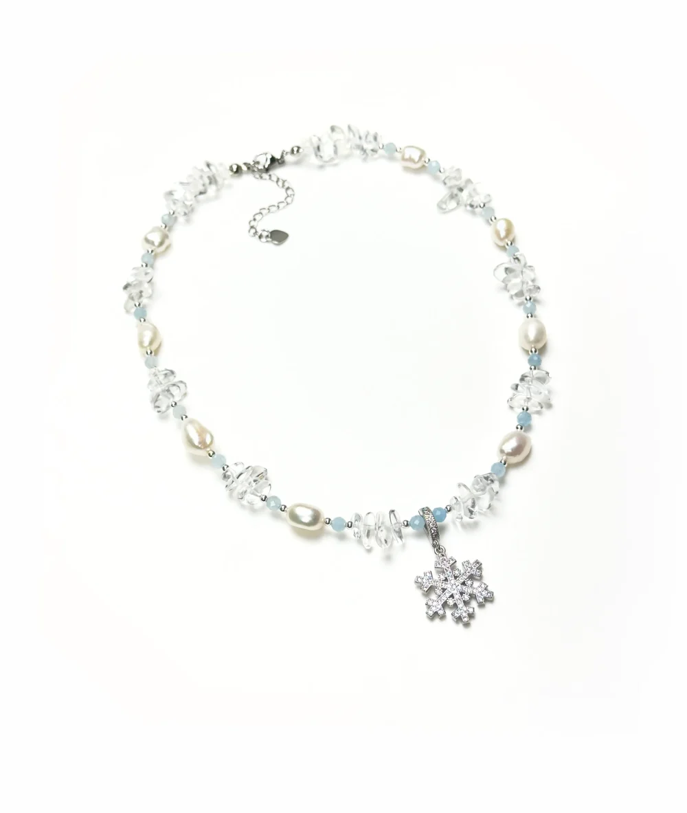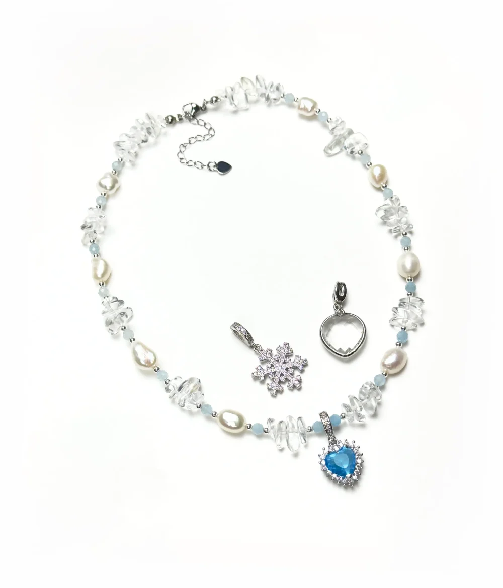 Состав изделия: натуральный жемчуг, аквамарин в ювелирной огранке, горный хрусталь фриформ, съемная подвеска на выбор (Снежинка, Голубое сердце, Сердце из горного хрусталя)