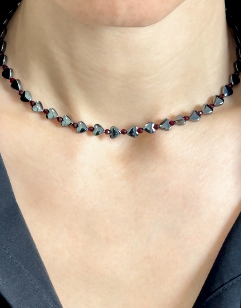 Гематит с его благородным металлическим блеском символизирует стойкость и уверенность. Сердечки придают украшению женственность и романтический шарм. Бордовая шпинель в сочетании с гематитом добавляет глубины и яркости, создавая эффектный контраст, который привлекает внимание.