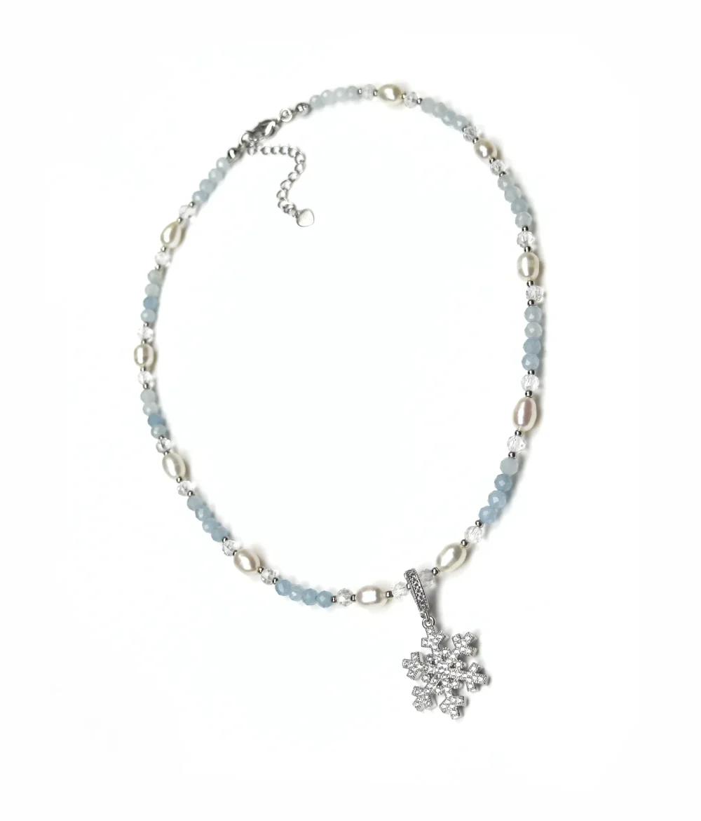 Колье СНЕЖИНКА — воплощение зимней сказки, выполненное из натурального жемчуга, аквамарина и горного хрусталя в ювелирной огранке. Его нежные оттенки создают впечатление легкости и воздушности, пробуждая ассоциации с холодным, сверкающим светом зимнего утра.