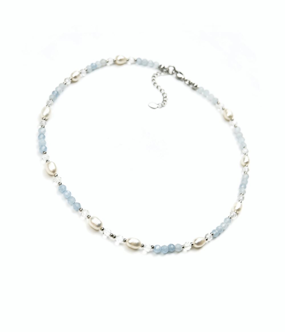 Жемчуг — символ чистоты и утонченности. Его нежные переливы создают атмосферу легкости, отражая свет и придавая образу изящество. Жемчуг способен дополнить любой наряд, добавляя образу романтичность и элегантность. Аквамарин, своими холодными голубыми оттенками, создает ощущение морозной свежести и чистоты, а горный хрусталь вносит в композицию икрящуюся прозрачность, словно мерцающий снег в лучах солнечного света.