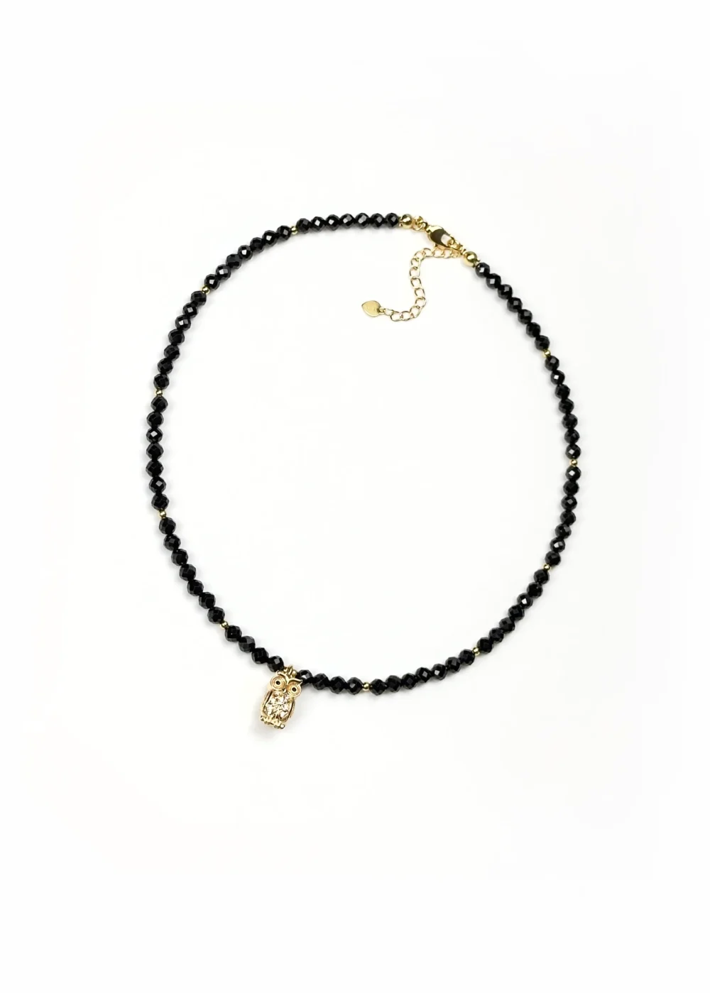 Колье СОВУШКА выполнено из черной шпинели в ювелирной огранке, благодаря которой оно переливается в лучах света, придавая образу эффектность и шик.