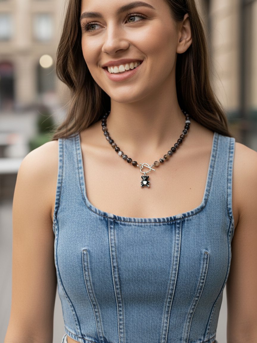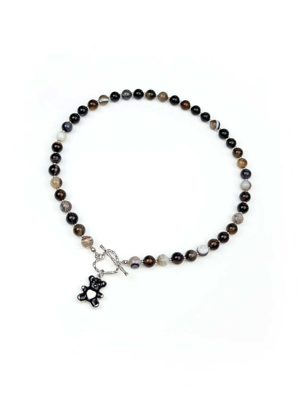 Миловидная подвеска в виде черного мишки с белым сердечком добавляет нотку игривости и теплоты, придавая украшению особый шарм.