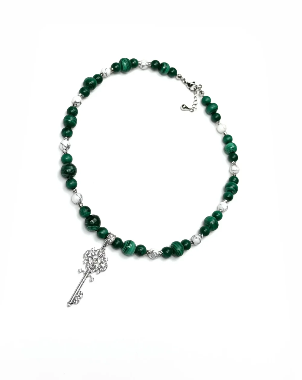 Колье ХОЗЯЙКА МЕДНОЙ ГОРЫ выполнено из натурального малахита с его насыщенным зеленым цветом и уникальным рисунком.